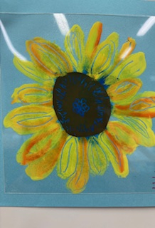 ほのぼのクラブの利用者様が描かれた見事なひまわりです。アクリル板の裏に描かれたものをひっくり返した