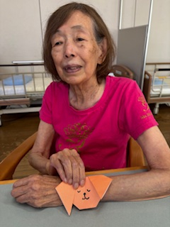 には、職員と共に犬を折って頂いたのですが、上手に出来上がりました。そして、出来上がりの作品を持って記念の