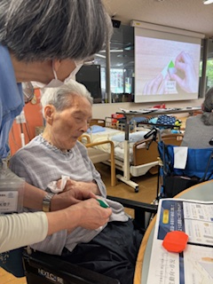 今日は手の不自由な利用者様と、折り紙で柿を作ります。最初はうつらうつらされていた利用者様ですが、職員が