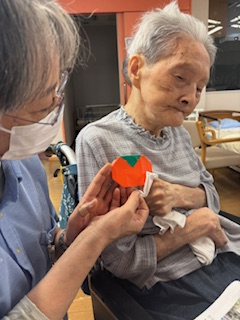 ところですが、利用者様は再び夢の世界へ……。職員は、とにかく作らなければと、手中して画面を見つつ、ヘタを折
