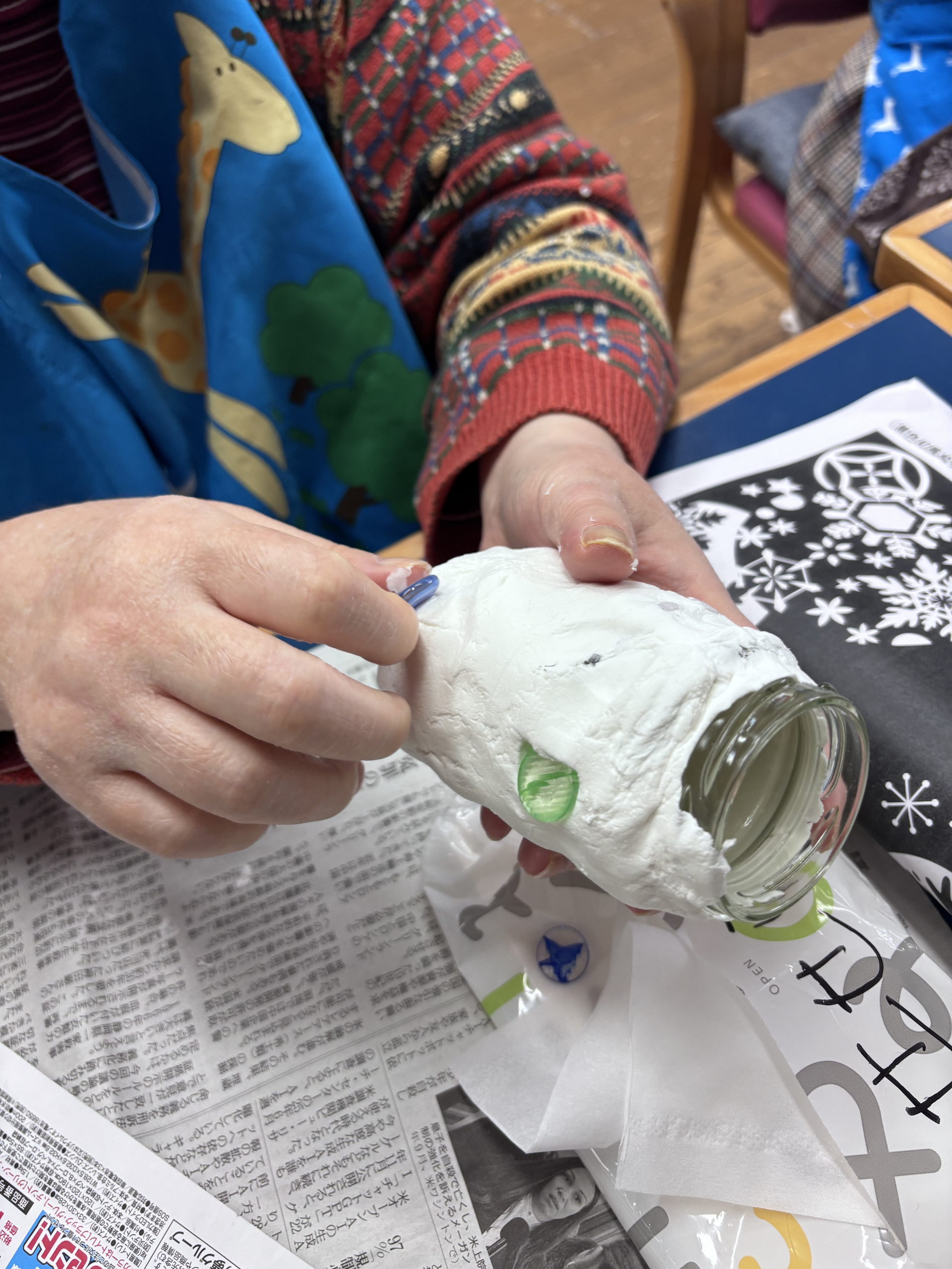 みなさまお好きなデザインを想像しながらビーズやおはじきを付けていきます。最後に絵の具を使ってカラフルに仕上げました⭐︎