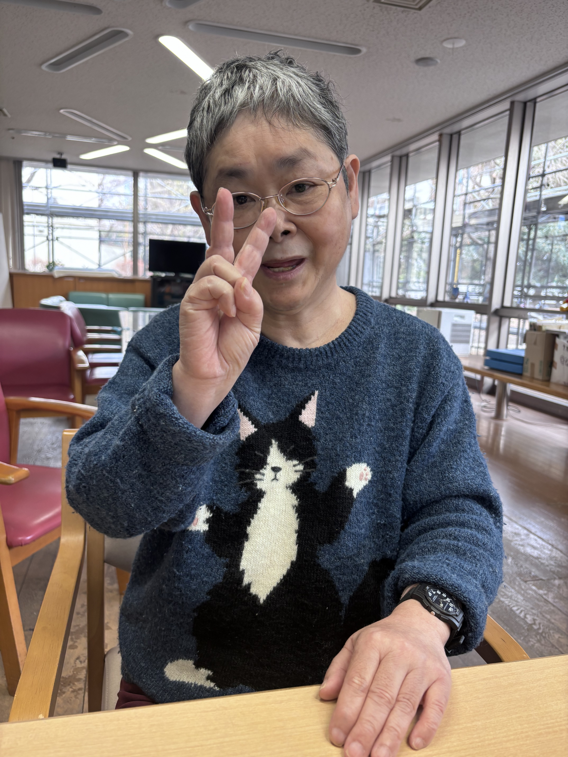 今回は猫好きのご利用者様が、可愛い猫柄のお洋服を着て来てくださいました。とてもお似合いだったので、思わずお写真を撮らせていただきました。