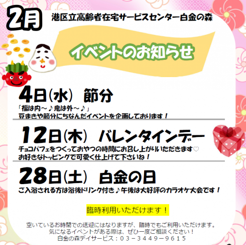 2026.03.17 地域の人たちと一緒にどんぐり公園の花壇を植え替え☆ 活動報告 #港区 #白金の森デイサービス #どんぐり公園 #花壇植え替え #鉢植え #寄せ植え #ボランティア 2026.03.16 【旅するランチ】北海道・サーモンのちゃんちゃん焼き☆ 活動報告 #港区 #白金の森デイサービス #ちゃんちゃん焼き #のっぺい汁 #旅するランチ #ランチイベント 2026.03.13 【ボランティア】慶応幼稚舎の学生さんと「懐かしい遊び」で大盛り上がり☆ 活動報告 #港区 #白金の森デイサービス #ボランティア #慶応幼稚舎 2026.03.11 【新聞紙体操】脳トレからストレス発散まで楽しみ方いろいろ☆ 活動報告 #港区 #白金の森デイサービス #新聞体操 #脳トレ #新聞紙 2026.03.10 【朗読ボランティア】人気コーナーでは「石川さゆりの世界」を紹介☆ 活動報告 #港区 #白金の森デイサービス #ボランティア #朗読 2026.03.05 【がんばれ!デウィ職員】傾聴の巻 活動報告 #港区 #白金の森デイサービス #新職員 #傾聴 2026.03.04 【ひな祭り】ひなあられゲームに桜茶とおはぎ。 活動報告 #港区 #白金の森デイサービス #ひな祭り #桜茶 #おはぎ #ひなあられゲーム 2026.03.04 【ボランティア】春先に歌いたい童謡や歌謡曲を10曲も熱唱☆ 活動報告 #港区 #白金の森デイサービス #ボランティア #みなトーク会 #ひなまつり #歌会 2026.03.03 【イベント食】春を感じる「ひな祭りランチ」☆ 活動報告 #白金の森デイサービス #港区 #ひな祭り #ランチ #ちらし寿司 #ひなあられ 2026.02.25 【調理レク】甘~いクレープ作りに挑戦☆ 活動報告 #港区 #白金の森デイサービス #レクリエーション #調理 #クレープ作り 2026.02.25 【脳トレ】国民の休日並び替えゲーム☆ 活動報告 #港区 #白金の森デイサービス #レクリエーション #国民の休日 #ゲーム 2026.02.24 2月イベントのお知らせ お知らせ #港区 #白金の森デイサービス #2月お知らせ #節分 #豆まき #バレンタイン 2026.02.23 【プラチナ美容塾】「美容と健康」意識が高い白金男子☆ 活動報告 #港区 #白金の森デイサービス #ボランティア #ハンドマッサージ #ネイルケア #プラチナ美容塾 2026.02.21 【ボランティア落語】「め」と「女」の読み間違いにフロアは大爆笑☆ 活動報告 #港区 #白金の森デイサービス #ボランティア #落語 #目薬 2026.02.20 【ボランティア】元気いっぱいの園児とみなトーク会さんによる節分イベント☆ 活動報告 #港区 #白金の森デイサービス #ボランティア #歌会 1 2 3 … 25