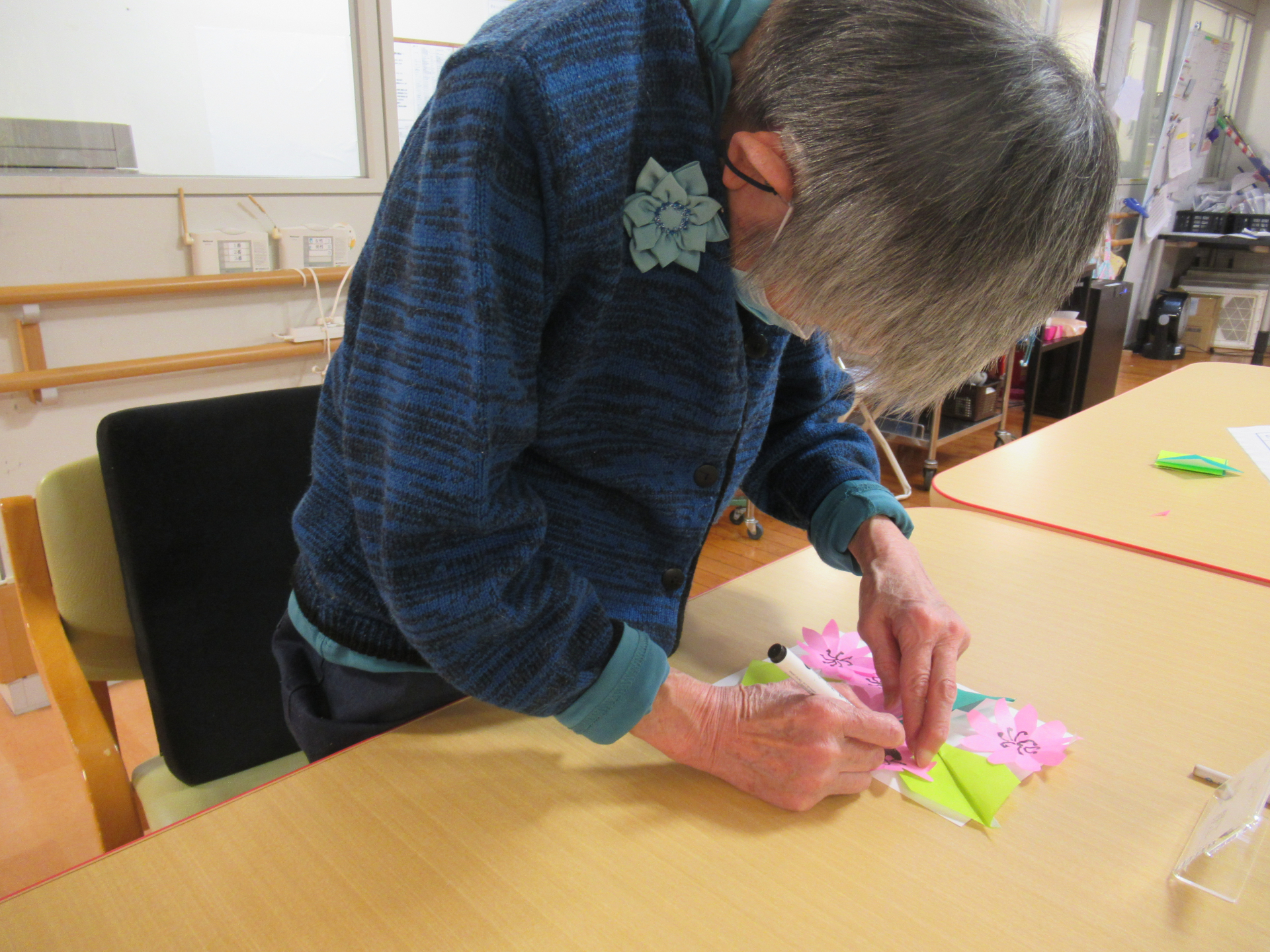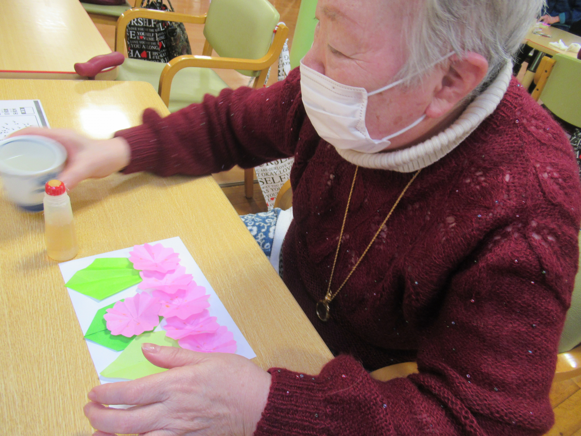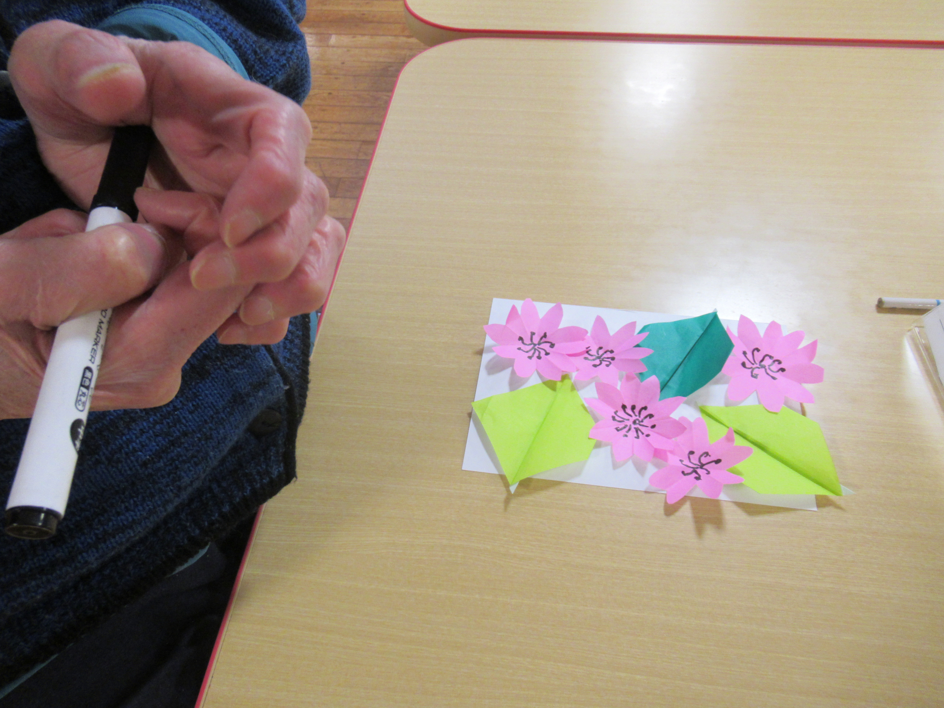 折り紙でさくらの花と葉っぱを作り、台紙に貼り付ける作業は