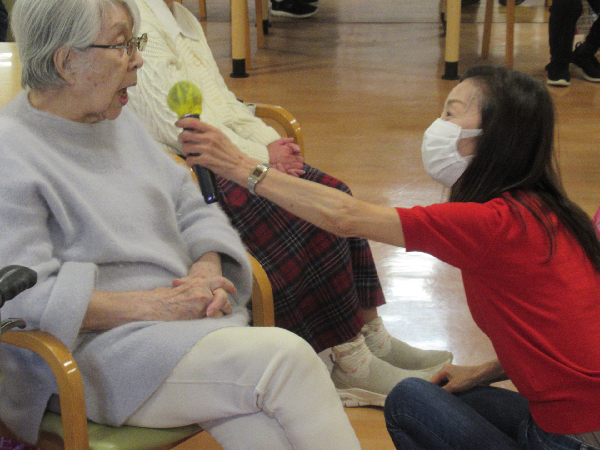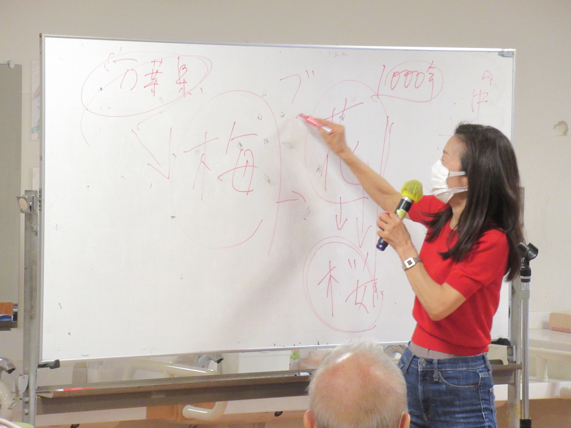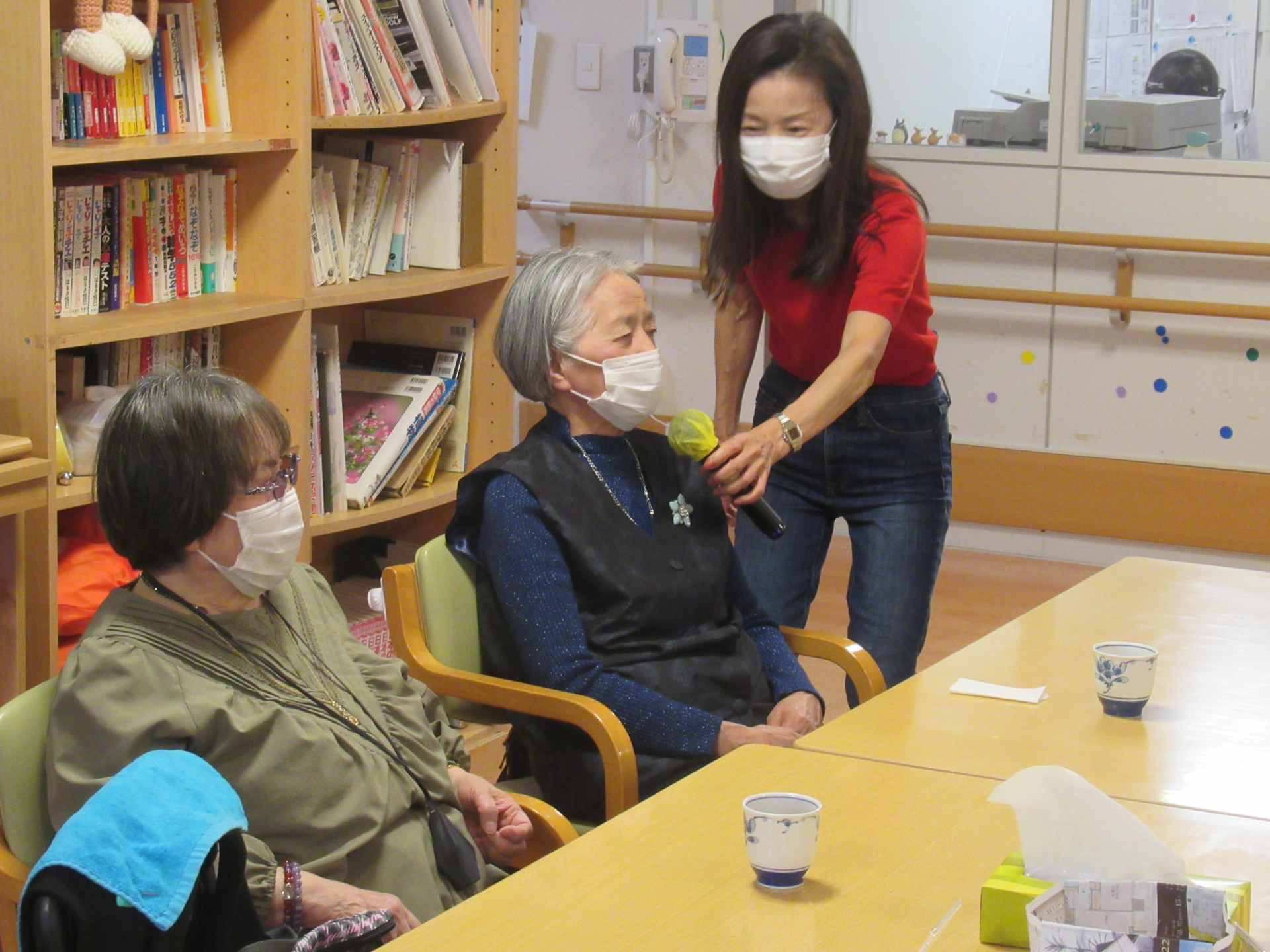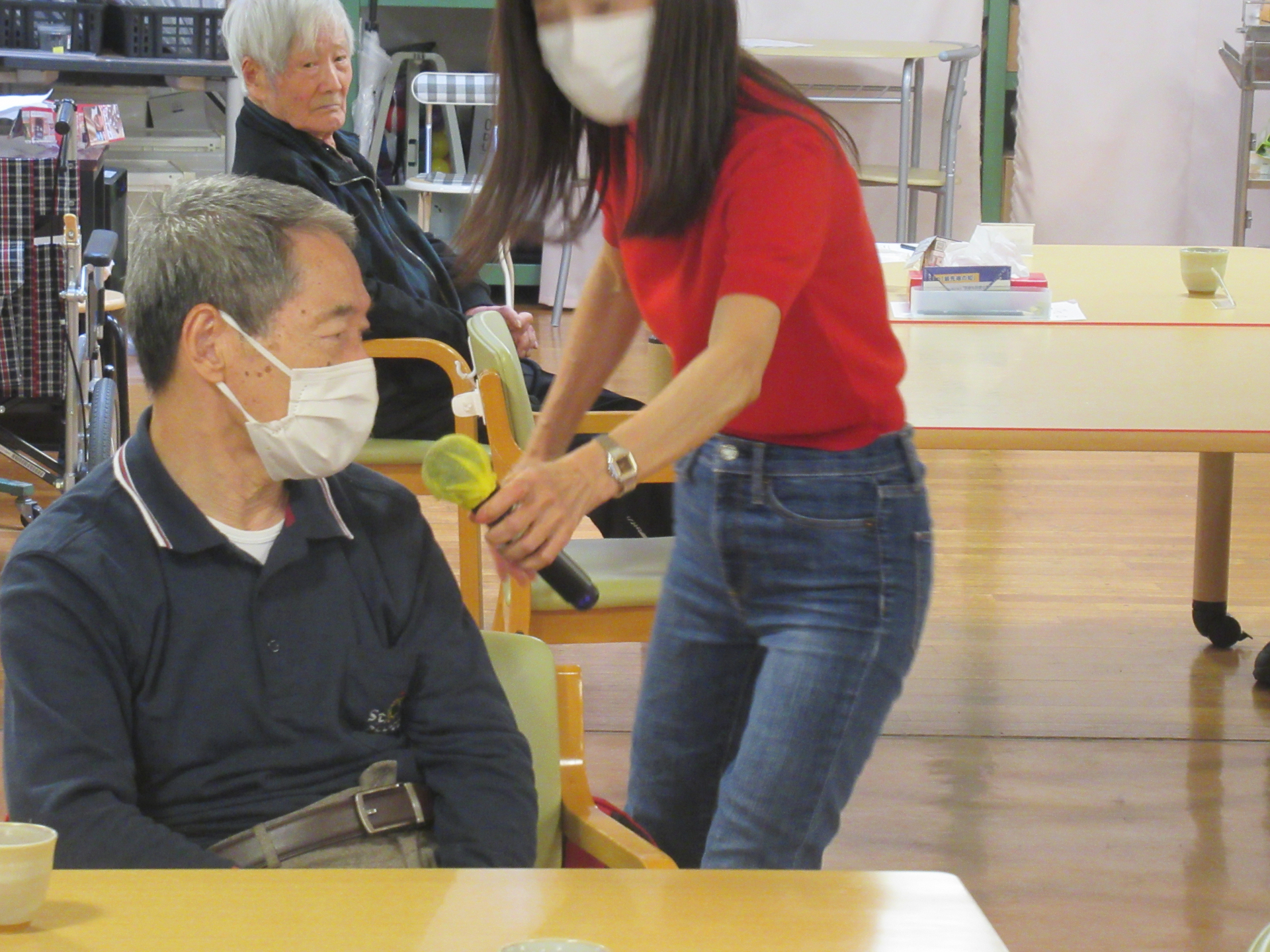 今回も「笑い」を交えてさまざまなトピックスをお話しくださった中村先生。時には歌を歌ったり、指体操をしたり、クイズに挑戦したり…ご利用者一人ひとりにマイクを向けながら双方向のコミュニケーションを届けてくださいました☆