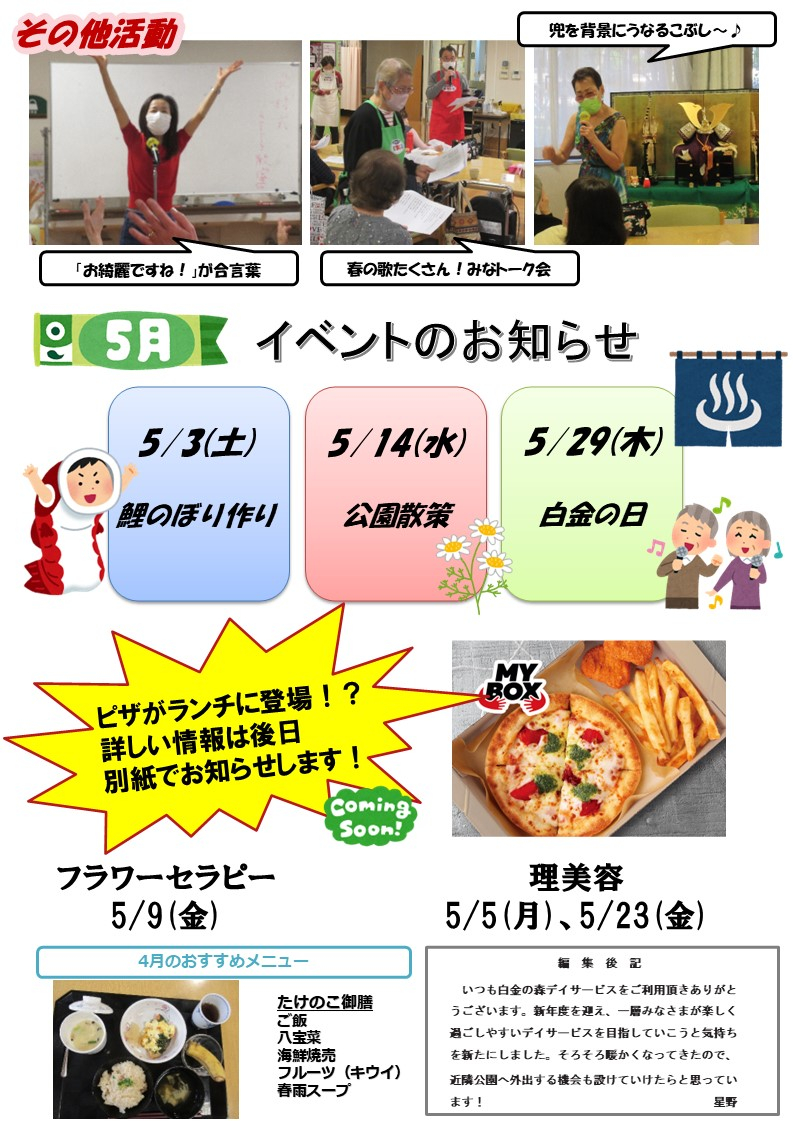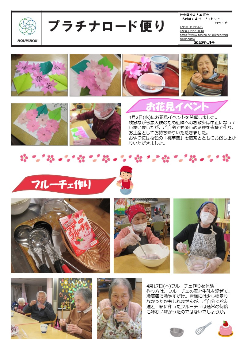 2025.05.01 お知らせ 5月の広報誌 Tweet シェアする 5月の広報誌をアップしました。 Y.H #奉優会 #デイサービス #レクリエーション #介護 #福祉 #イベント #広報誌 前の記事 2025.05.03 お知らせ 5月フラワーセラピーの作品見本が届きました 次の記事 2025.05.01 お知らせ 【午後レク】コグニサイズ・輪唱・ボッチャ・ハンドベル♪ 一覧へ戻る