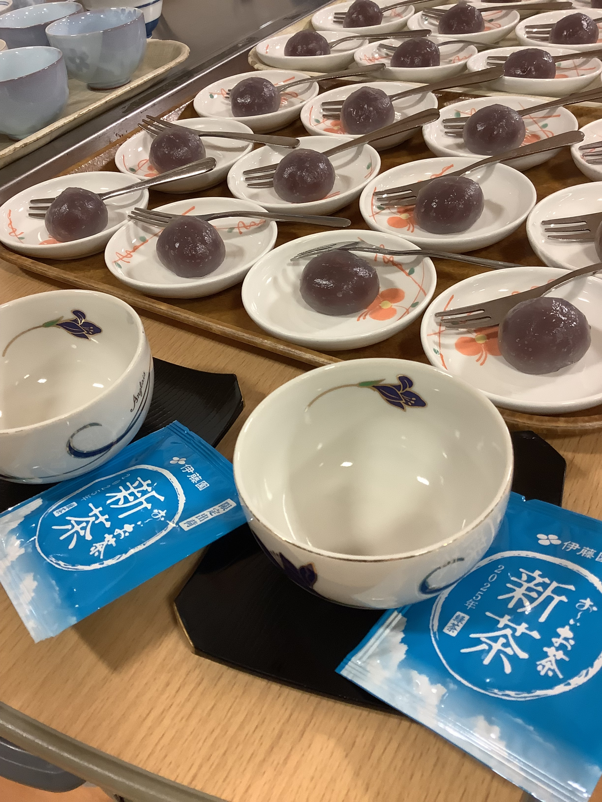 お散歩のあとは、お楽しみのおやつ。「水まんじゅう」に合わせて今回は「2025年の新茶」をご用意しました☆