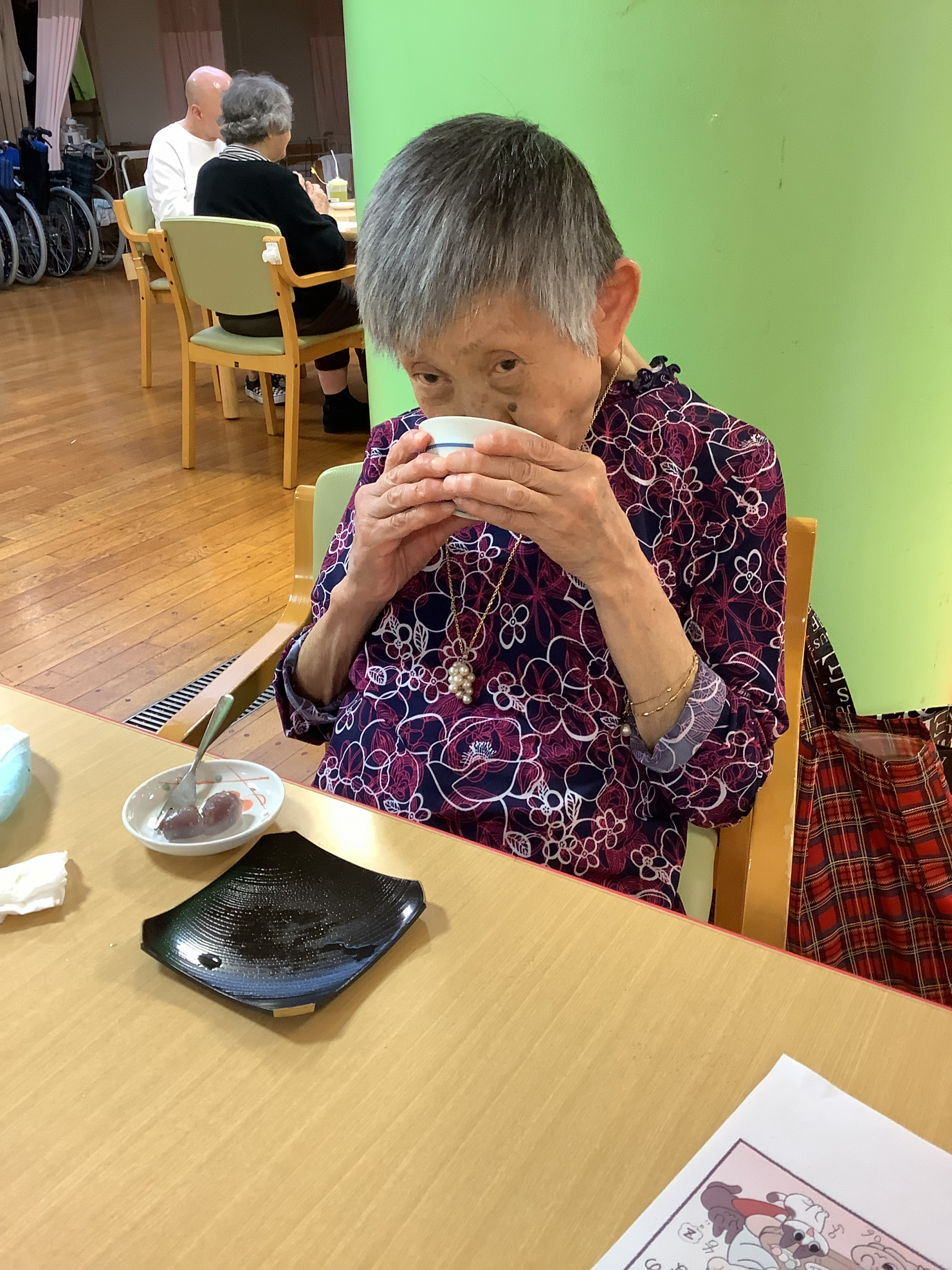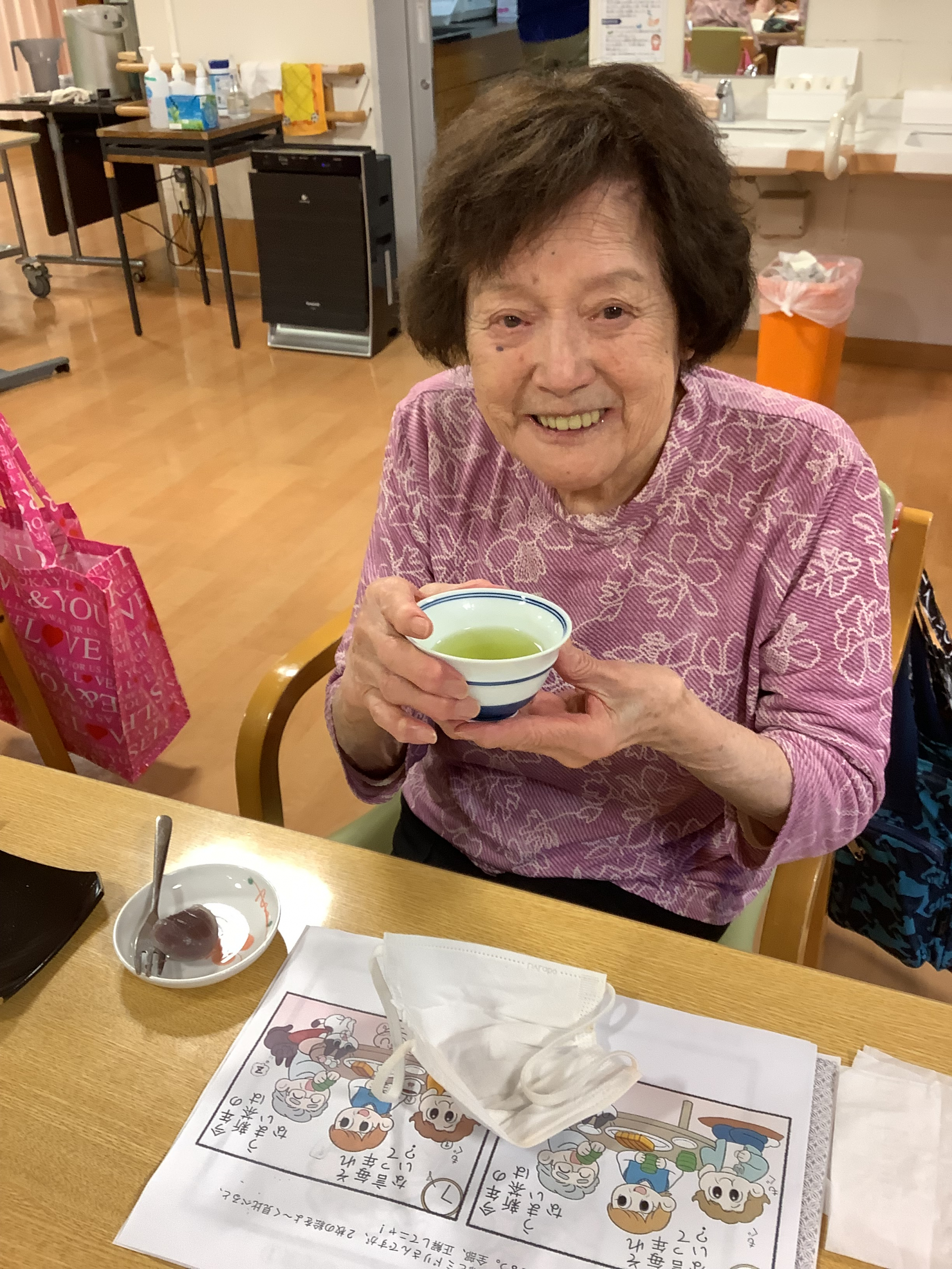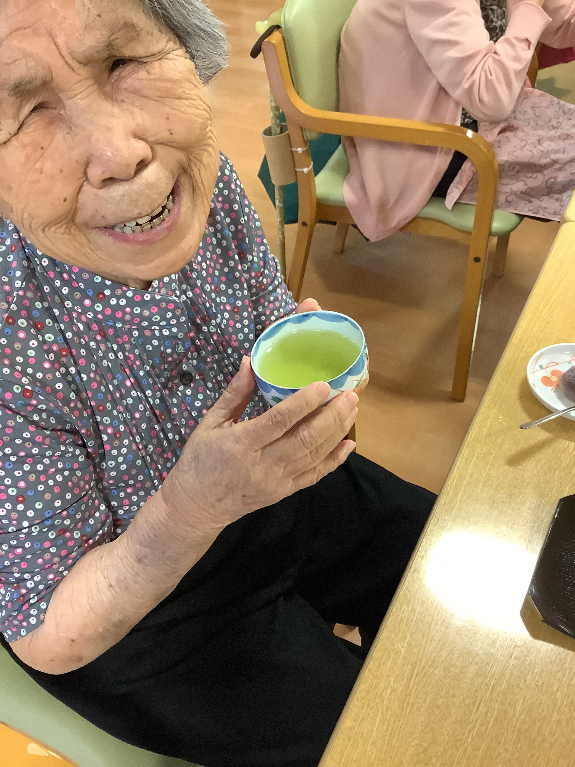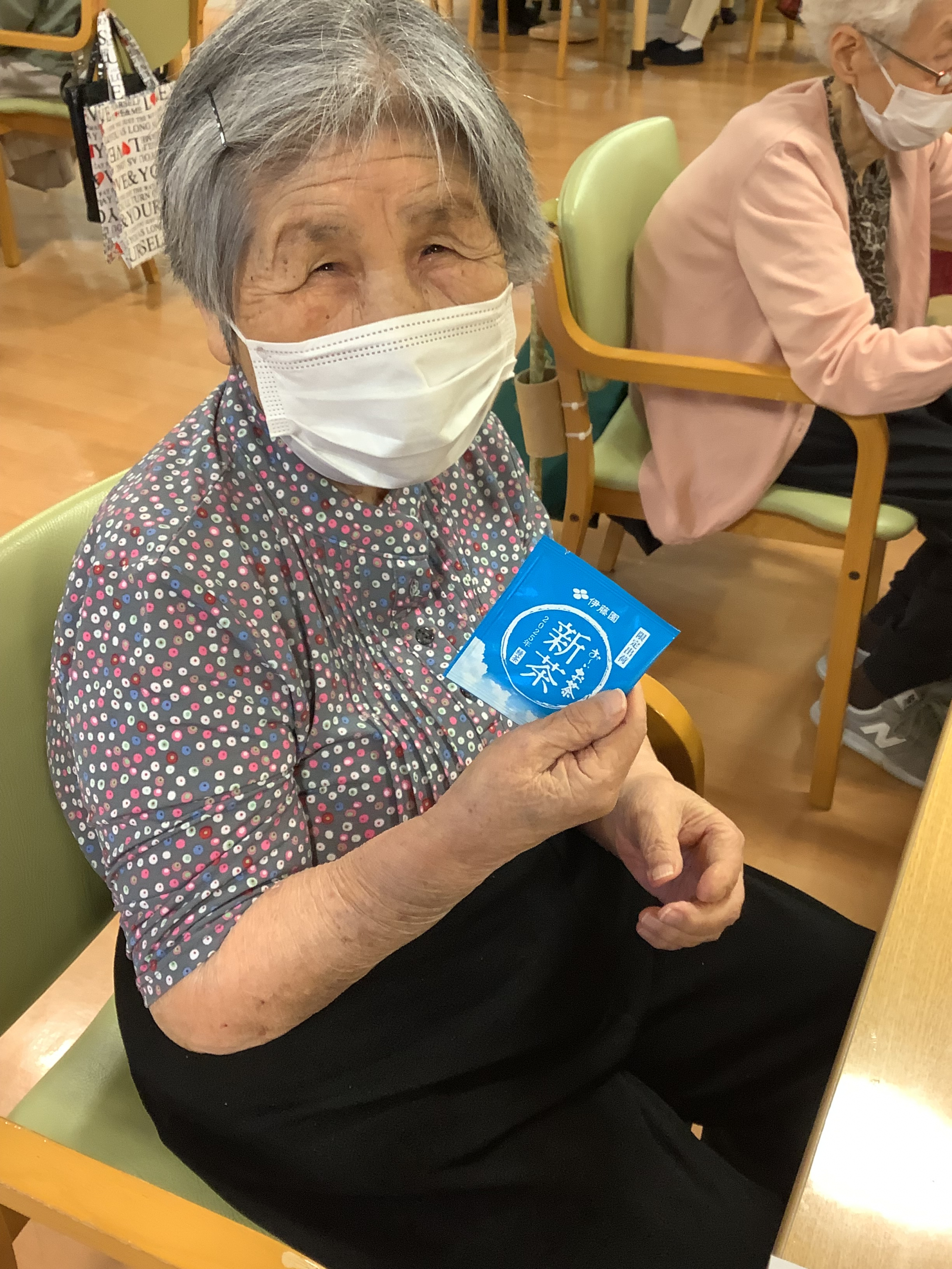 お一人につき新茶のティーパック一つをお配りし、お好みの濃さでお楽しみいただきました。みなさんからは「美味しいねー」「やっぱり新茶は色が違うわね~」「今年の新茶初めて飲んだわ!ありがとうね」「えー!一人一つなんて贅沢!そんなことしたことないわ(笑)」など、いろいろな感想が聞かれました☆