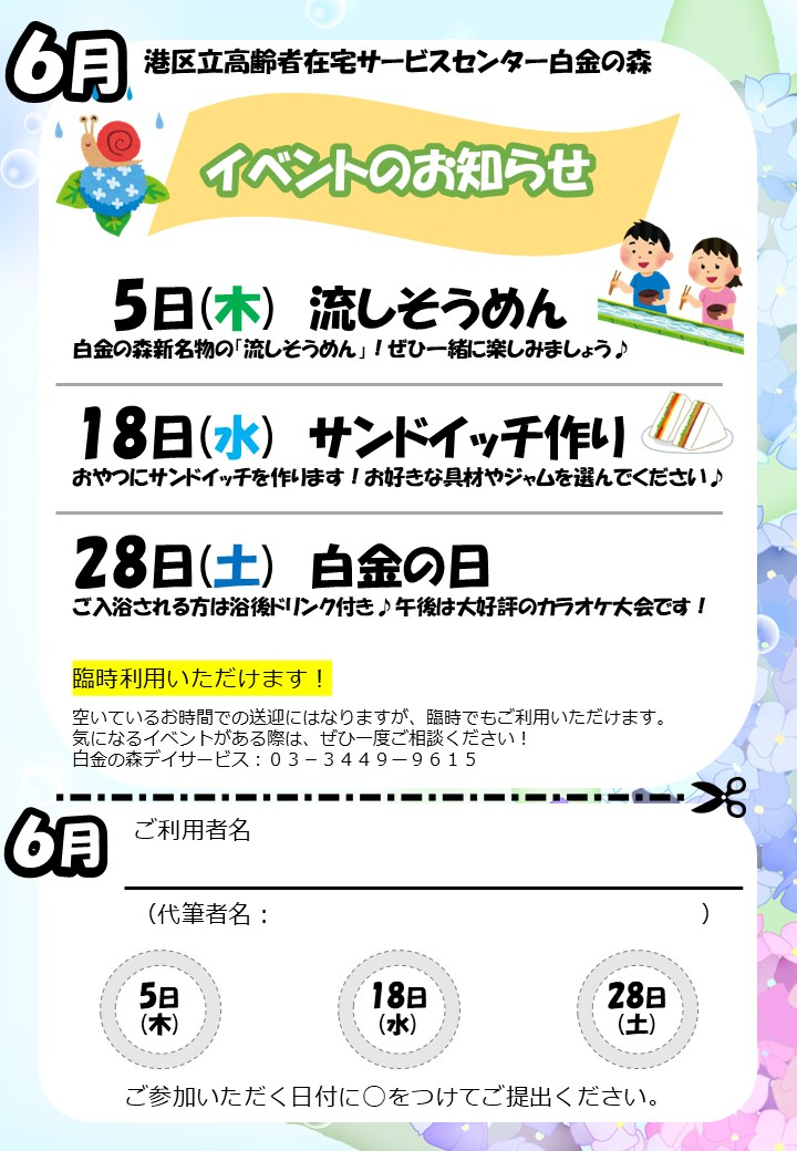 2025.06.02 お知らせ 6月イベントのお知らせ Tweet シェアする 6月イベントのお知らせです。 昨年購入した「流しそうめん器」が好評だったため、今年も開催します♪ 暑い夏を一緒に乗り切りましょう♪ #奉優会 #レクリエーション #介護 #イベント 前の記事 2025.06.02 お知らせ 6月の献立表 次の記事 2025.05.28 お知らせ 【ボランティア】淳子先生の「ねえ、おっ母さん…」に拍手喝采☆ 一覧へ戻る