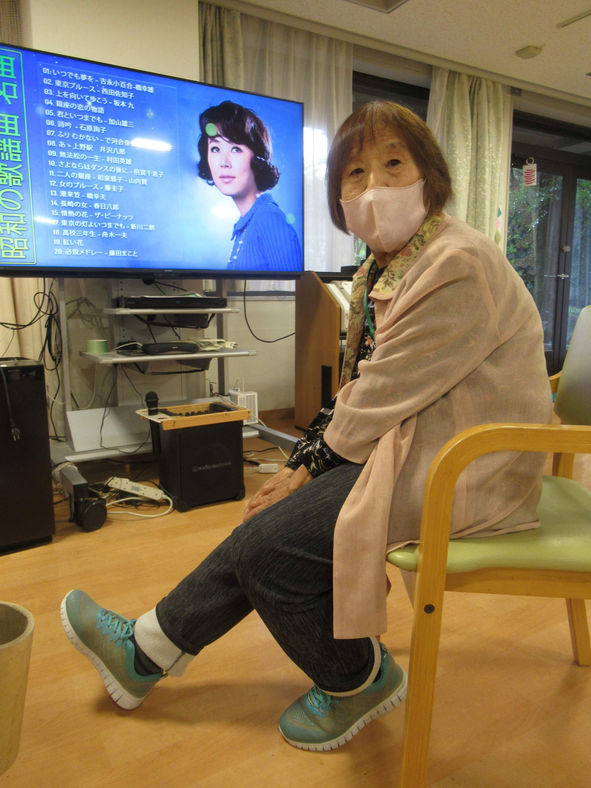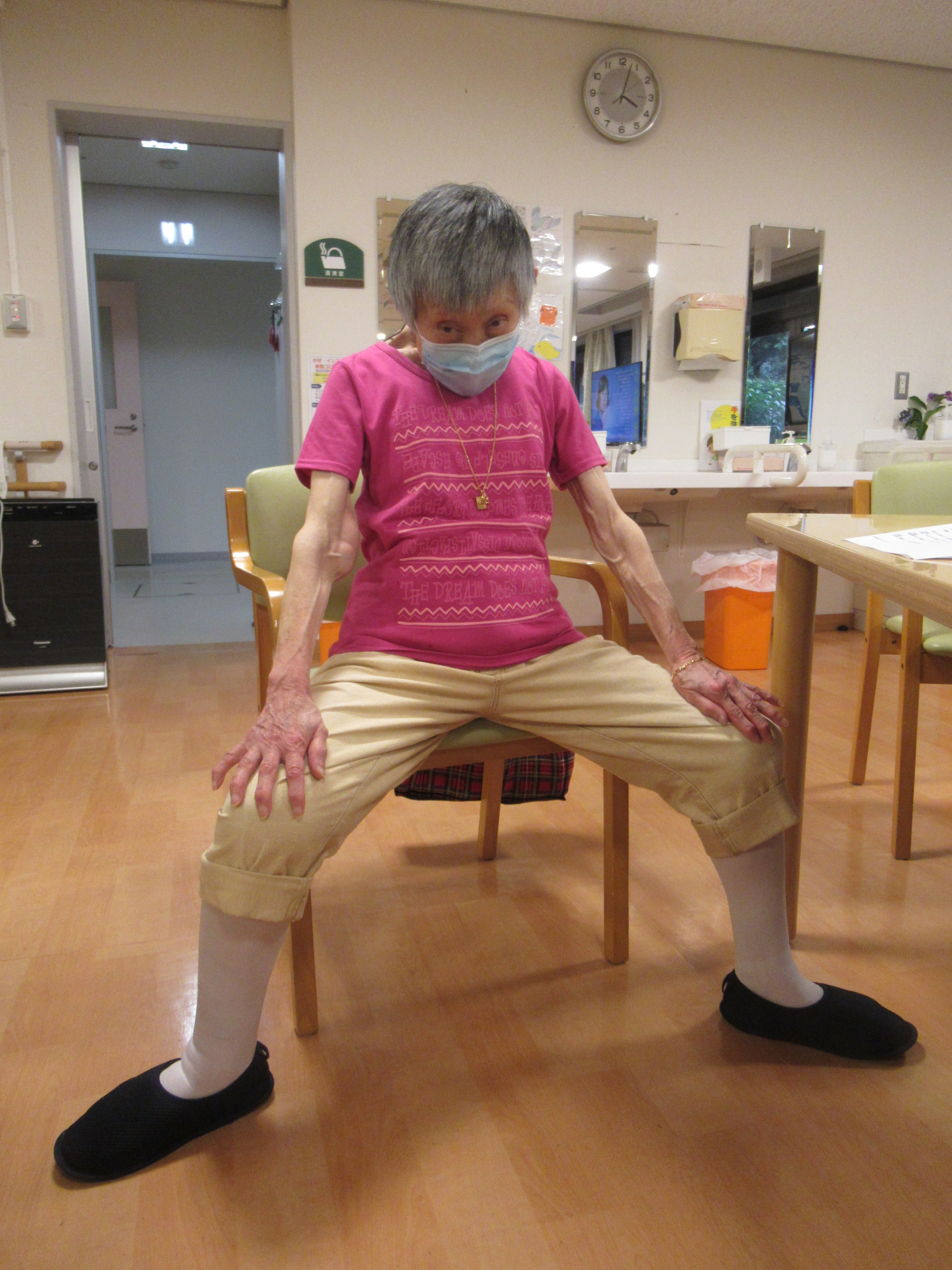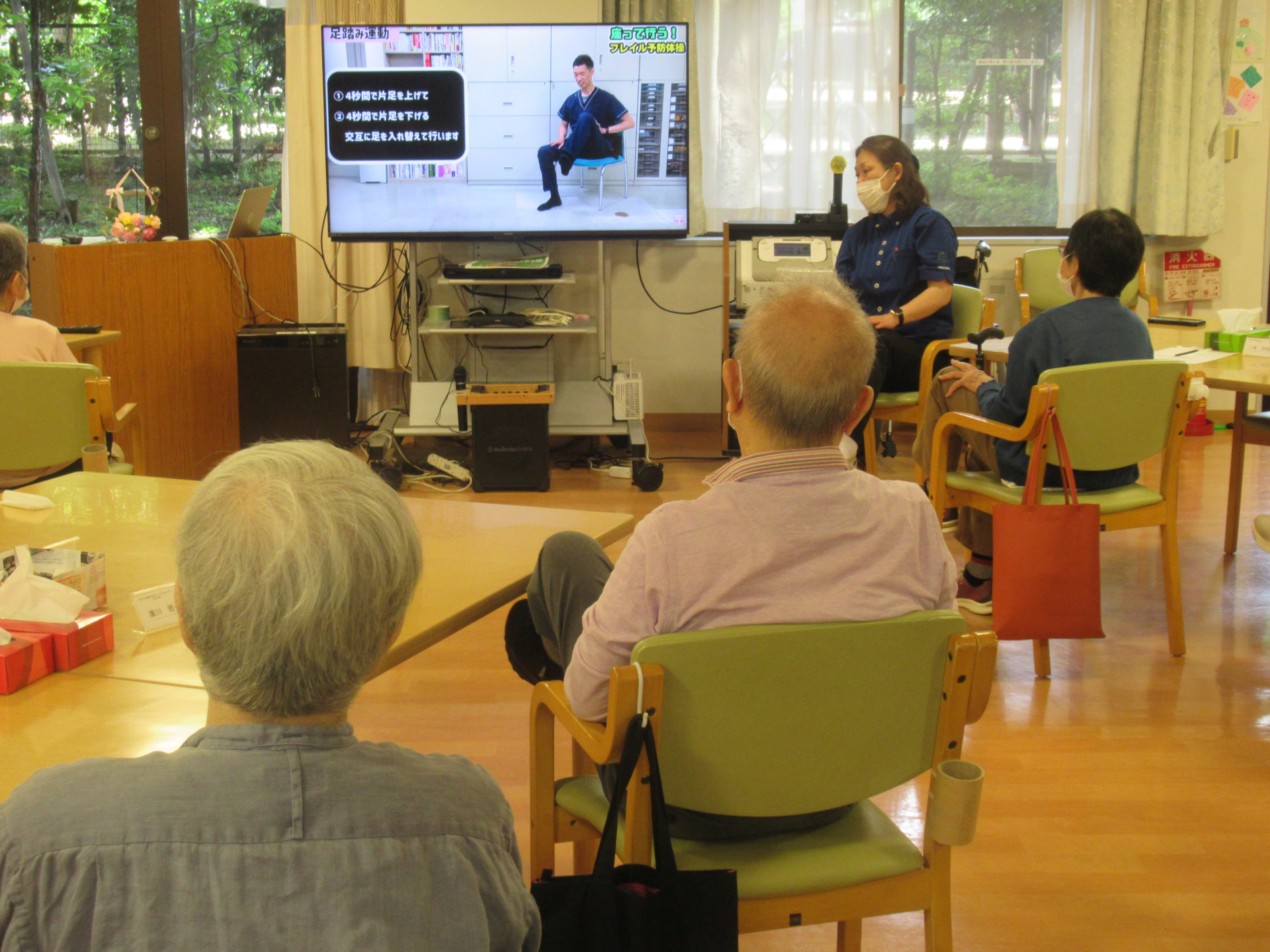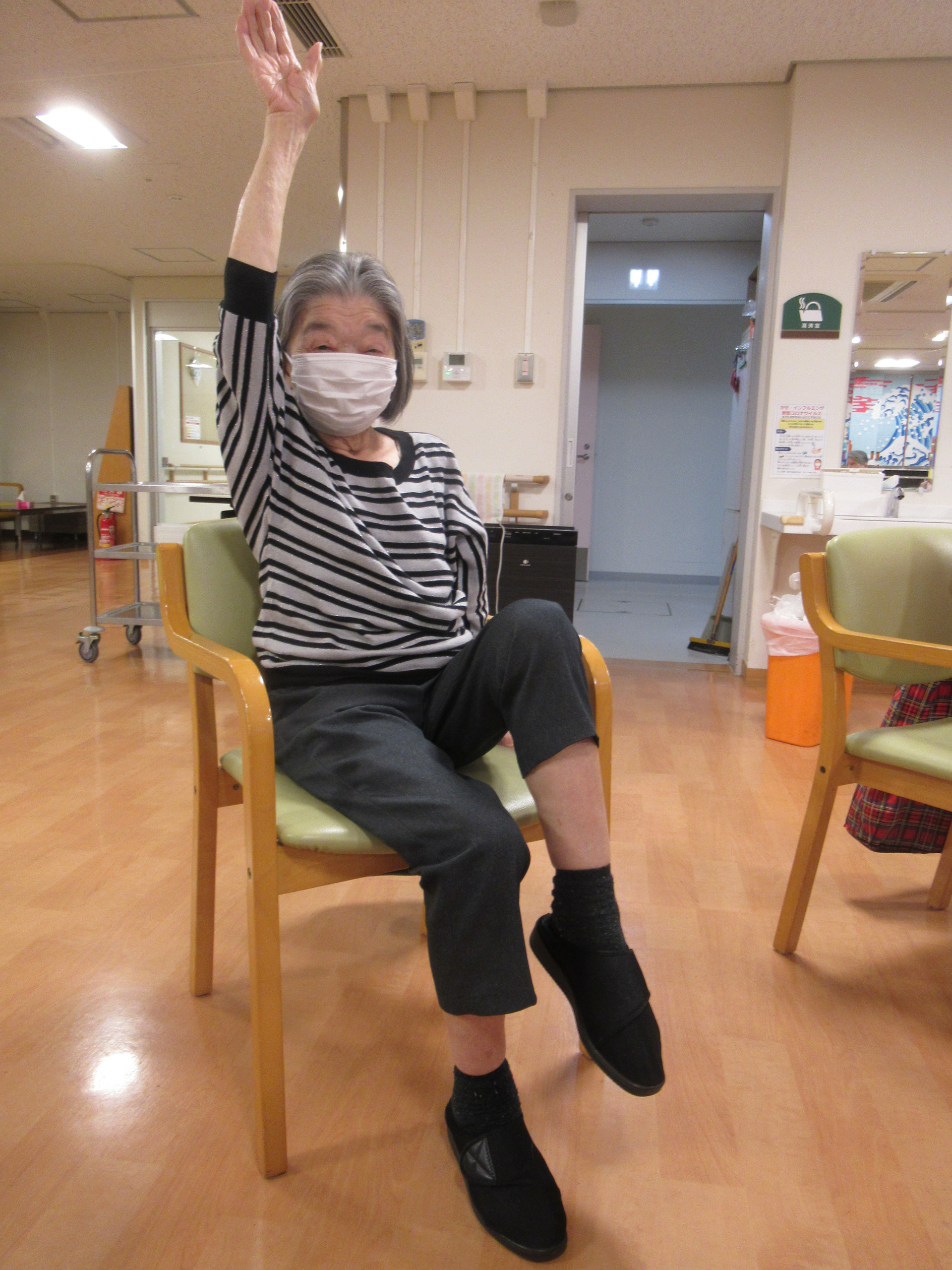 今日も午後レクのゲーム「ボッチャ」の」前に、準備体操も兼ね、下肢運動を中心とした転倒予防体操を行いました!