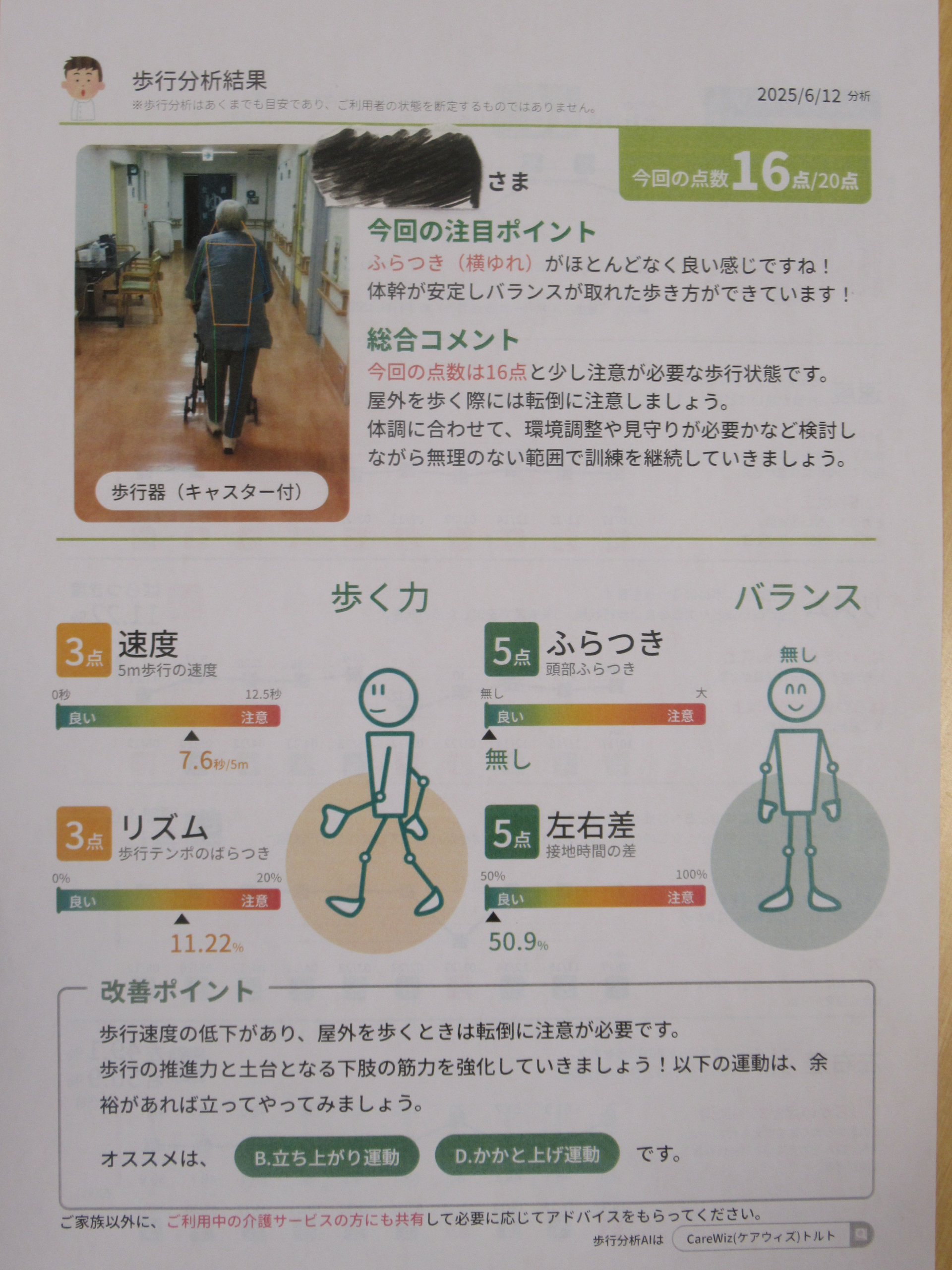 白金の森デイサービスでは、まずAIによる歩行状態分析ツール「トルト」を利用し、毎月出されるレポートをもとに現状を把握。分析結果の「改善ポイント」として挙げられた「おすすめ運動」を個別に取り入れることで、より効果的なリハビリを計画的に行っています。