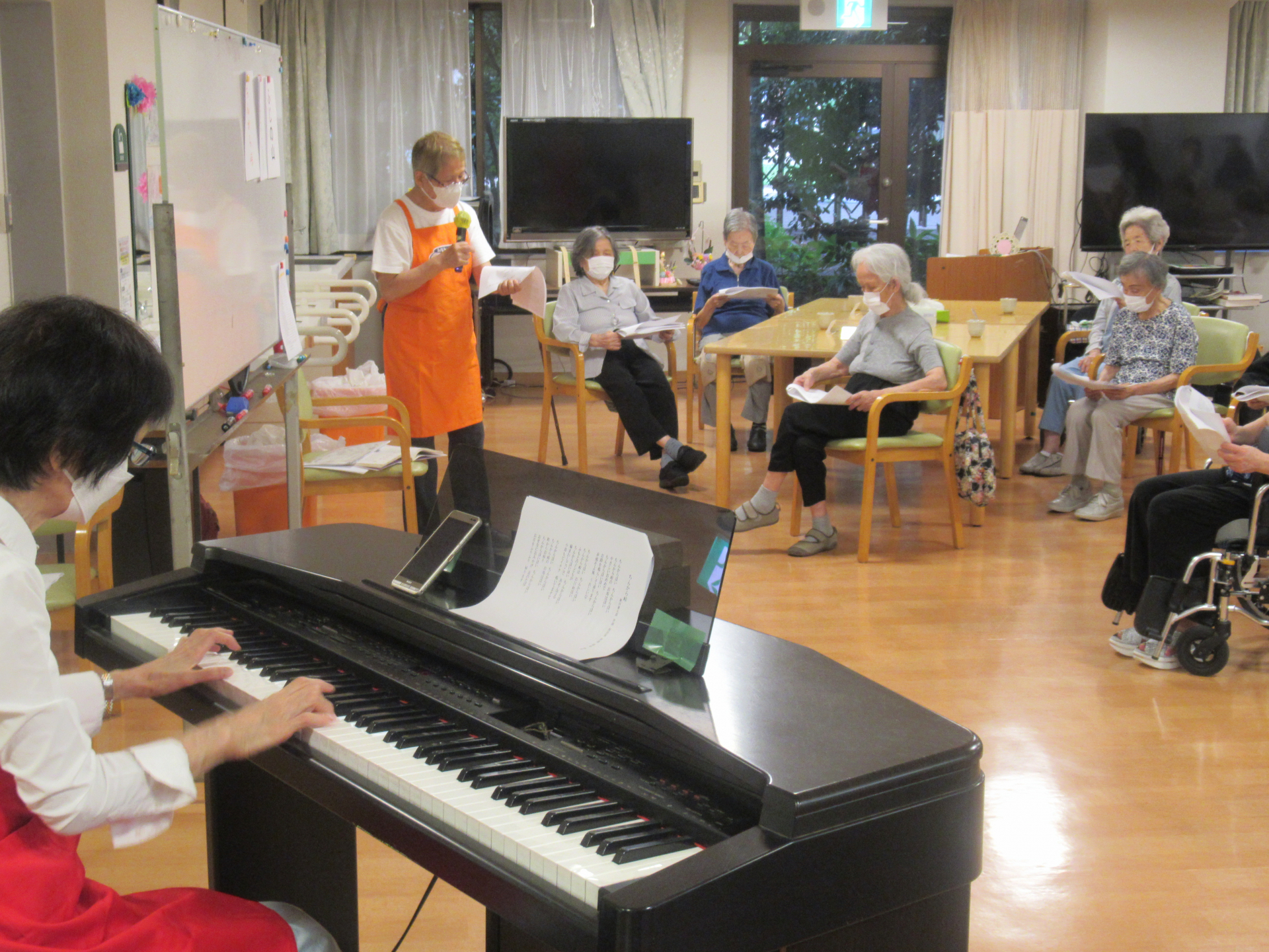 「海開き」や「山開き」がニュースになった今日7月1日、ボランティア「みなトーク会」さんが来所され、ピアノの生演奏に合わせた歌会が開催されました。