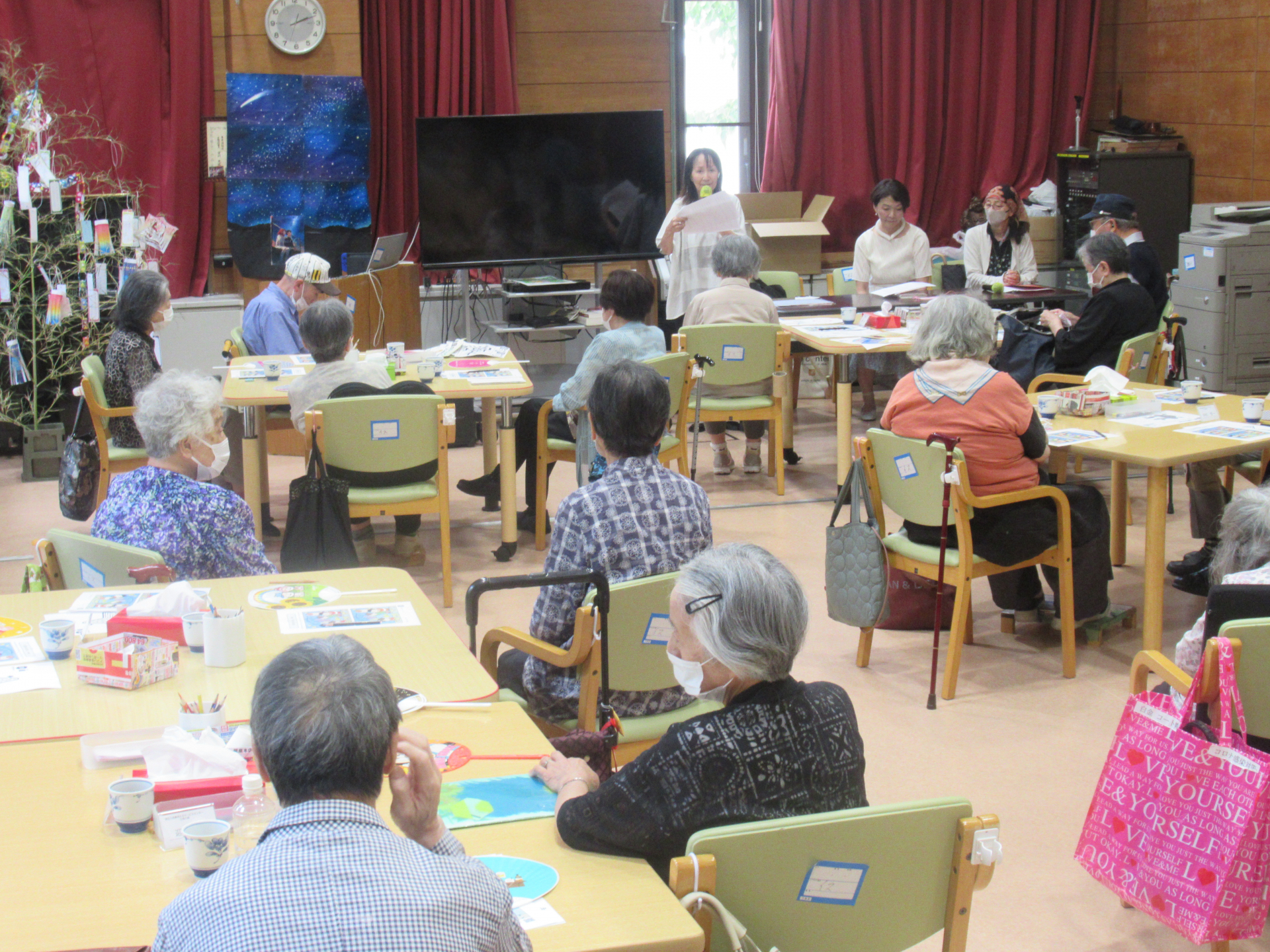 七夕のお話を通して、織姫・彦星の関連性クイズや七夕にソーメンを食べるようになったお話など、いろいろなエピソードをお話ししてくださいました。ご利用者のみなさんからは「へ~」が連発。最後は『お座敷小唄』の替え歌『白金の森小唄』をみんなで合唱しました☆
