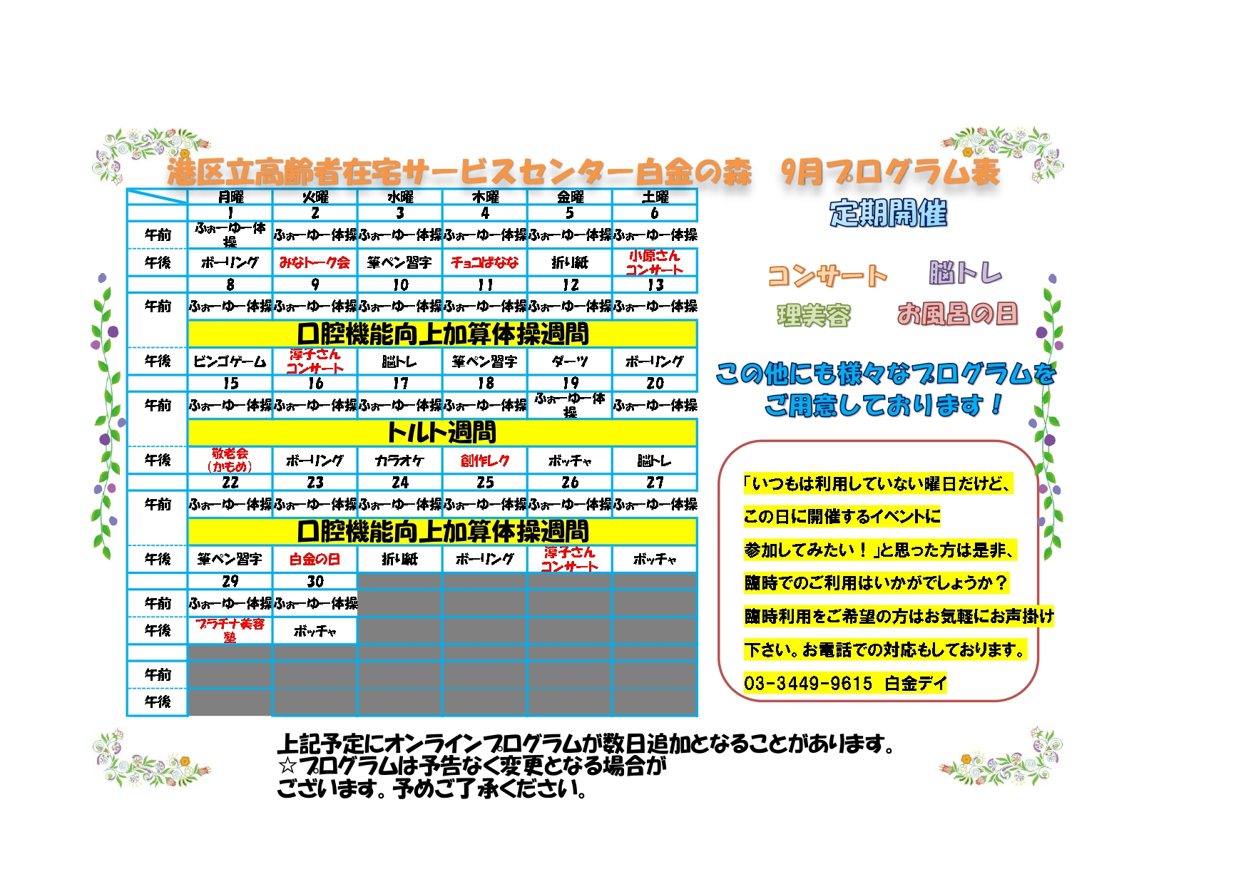 2025.09.01 お知らせ 今月のプログラム表 Tweet シェアする 今月のプログラム表をお知らせします。 #デイサービス #イベント #港区 前の記事 2025.09.01 お知らせ 今月の献立表 次の記事 2025.08.29 お知らせ 【創作レク】次回はいつもと違う和テイスト 一覧へ戻る