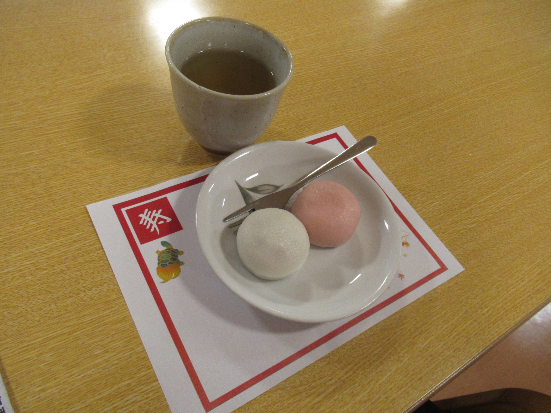 おやつはこれまたおめでたい「紅白饅頭」。緑茶と一緒にみなさまペロリと召し上がられていました☆