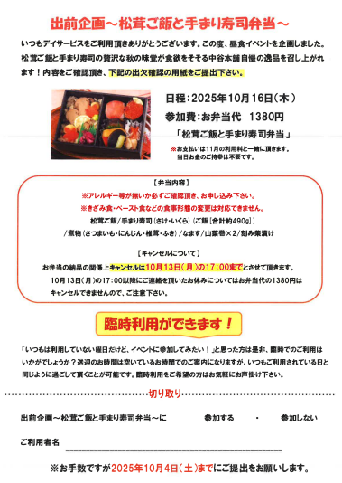 秋の味覚、松茸ご飯も楽しみつつ、手まり寿司も一緒に味わえるお弁当の出前企画を10月に開催します!