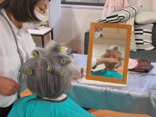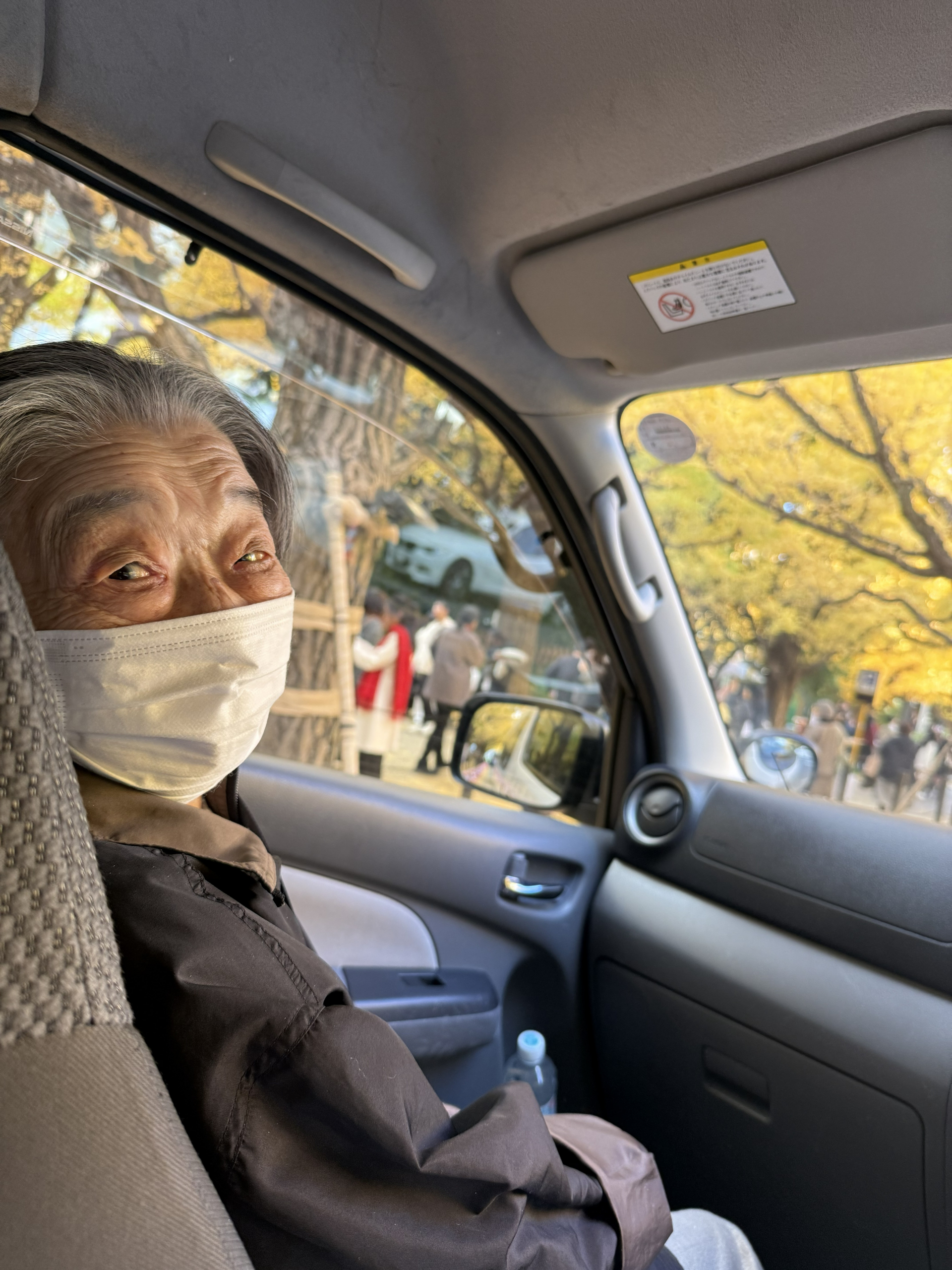 送迎車は車高が少し高いので、黄色い落ち葉が積もった歩道を上から眺められます。