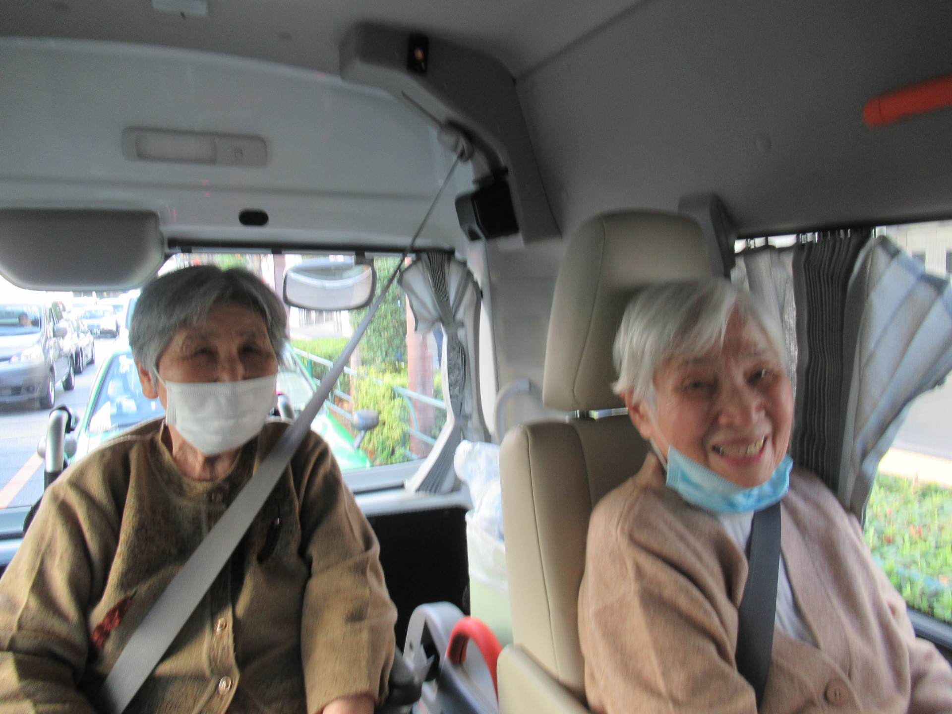 送迎車は車高が少し高いので、黄色い落ち葉が積もった歩道を上から眺められます。