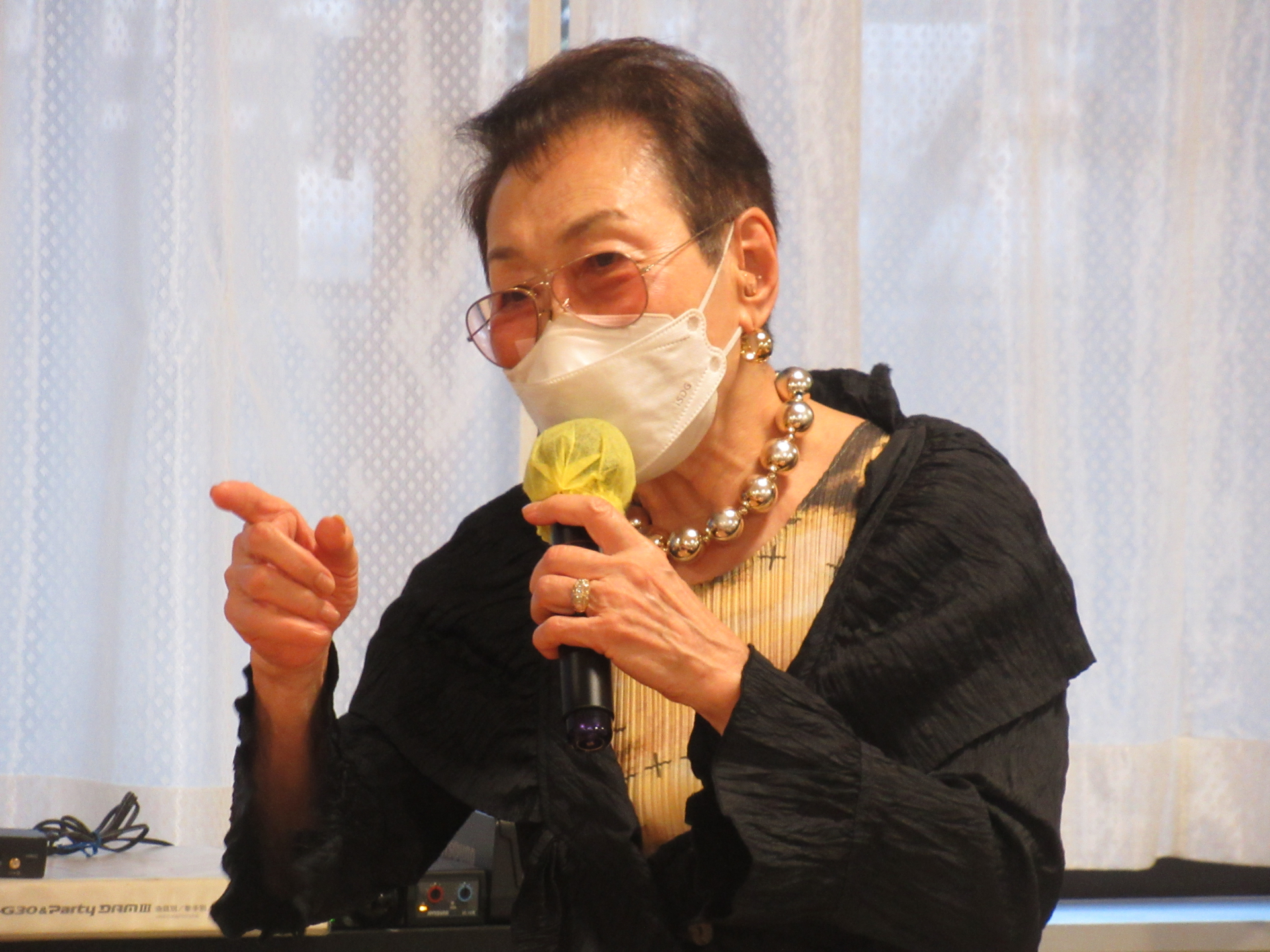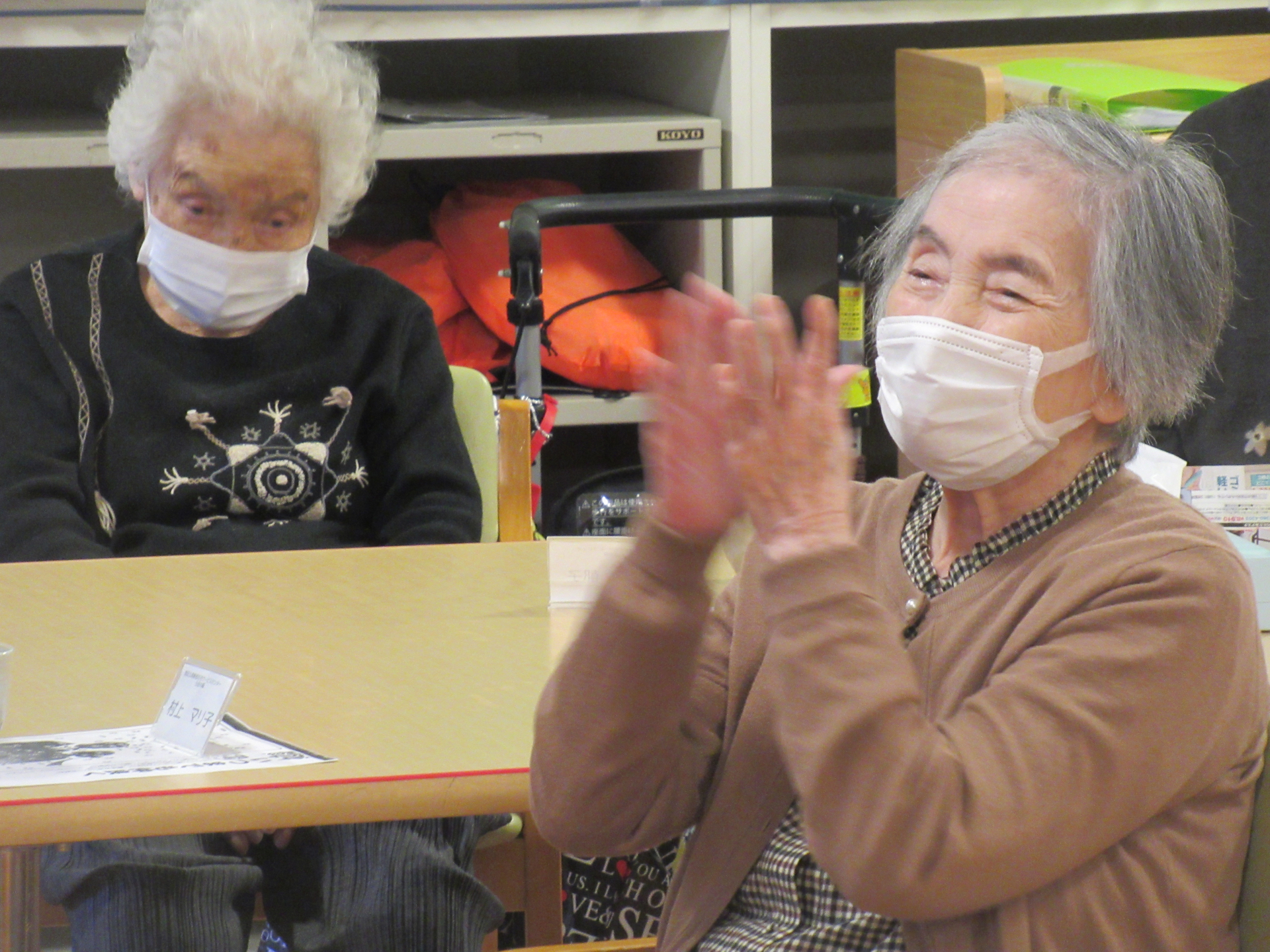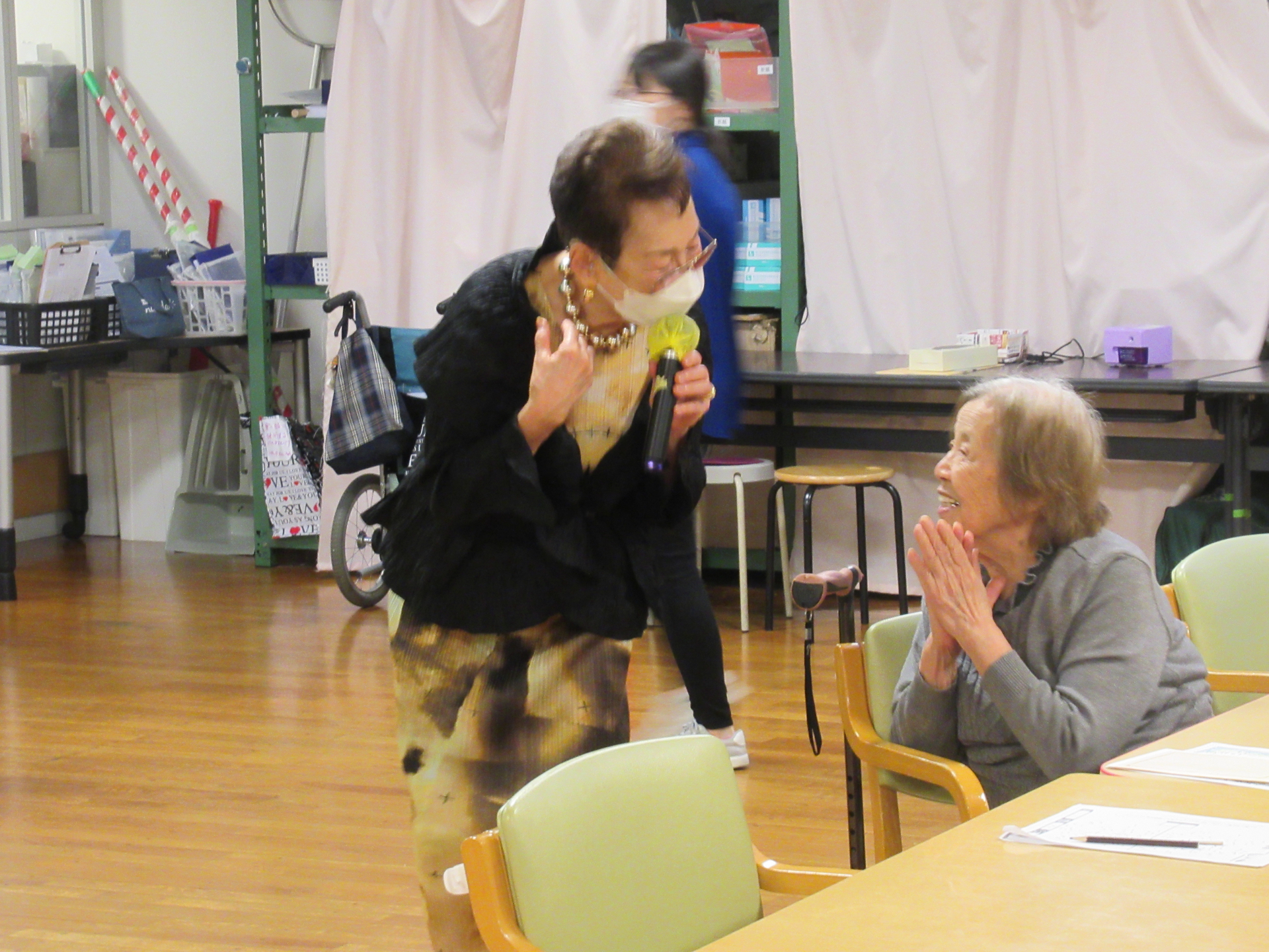 アンコールでのこと。淳子さんが越路吹雪さんの『サン・トワ・マミー』歌ってるとき、「私この歌が大好きだったの!うれしい!!」と歓声が上がりました。これには淳子さんも大興奮。ご利用者とふたり視線を合わせて、『サン・トワ・マミー』を熱唱してくださいました☆
