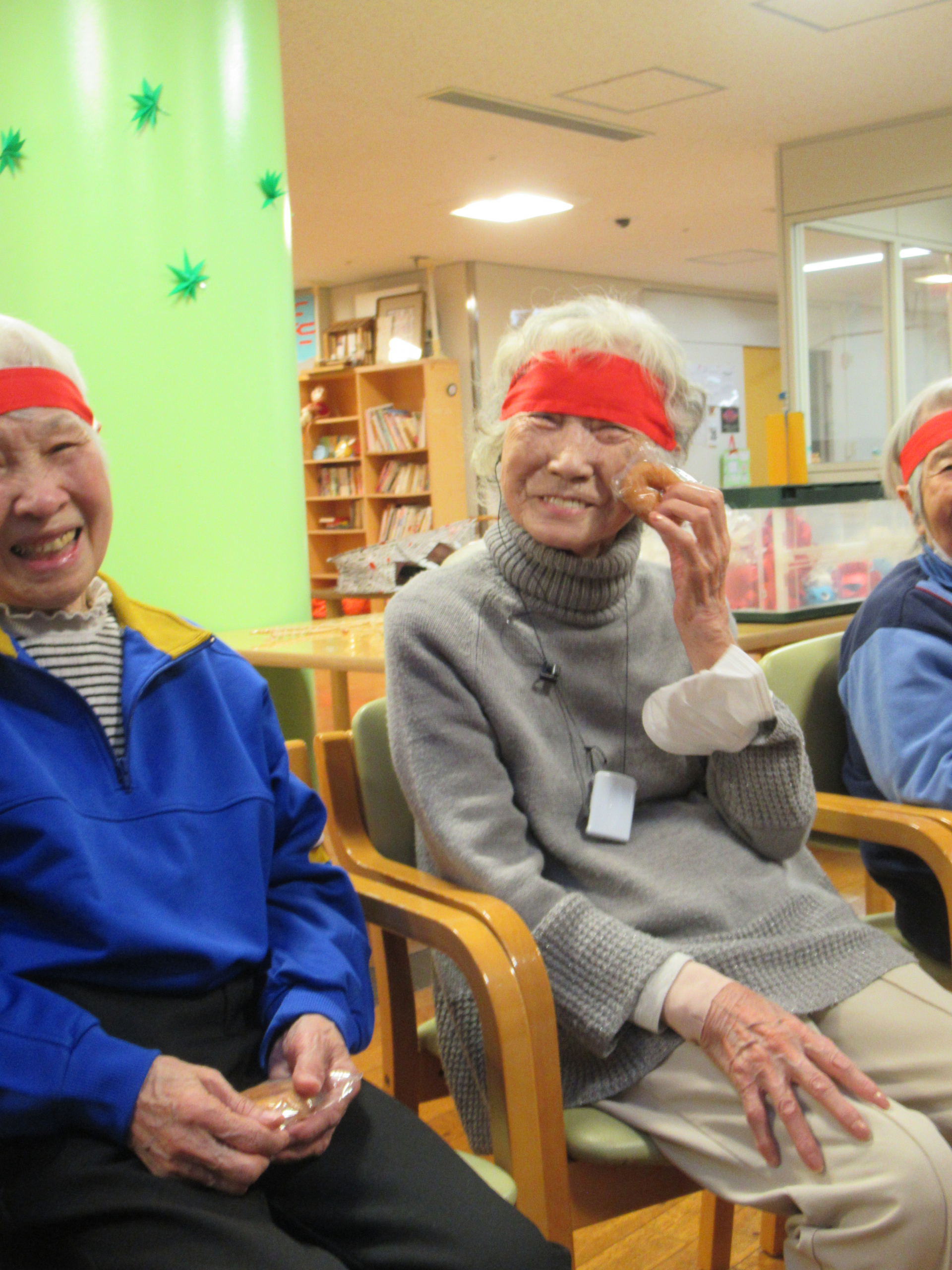「パン食い競争」は、小分けにされたミニドーナツを口を使って洗濯ばさみから外す競技です。この種目は、動くドーナツに悪戦苦闘される方が続出(笑)大きな口を開けてドーナツを追い回す様子に、周りのご利用者も大盛り上がりで「笑いすぎて涙が出ちゃった(笑)」と話されている方もいらっしゃいました☆
