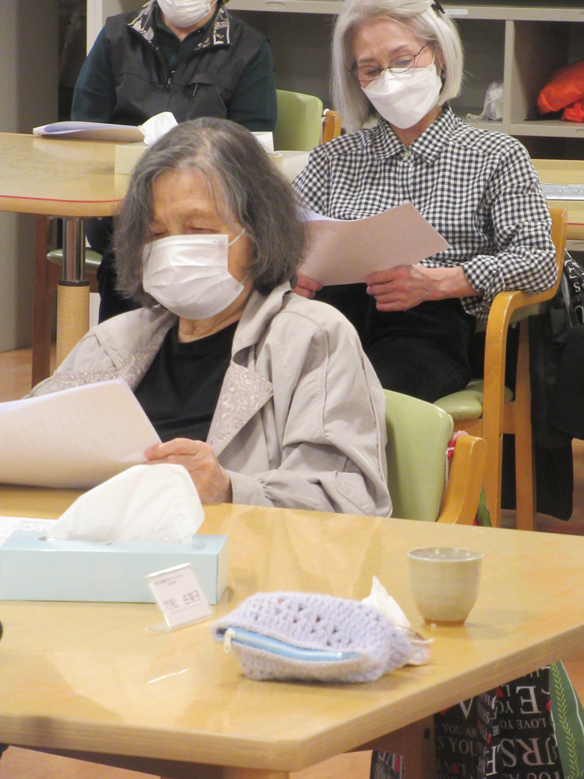 デューク・エイセスの『女一人』では、「これはよく聞くと失恋京都旅行の歌なんですね(笑)」「『結城に塩瀬の素描の帯』に『大島つむぎにつづれの帯』に『塩沢がすりに名古屋帯』って、この女は着物をずいぶんたくさん持っていますね~(笑)」と歌詞の解説も絶妙で、ご利用者の大笑いを誘いました☆