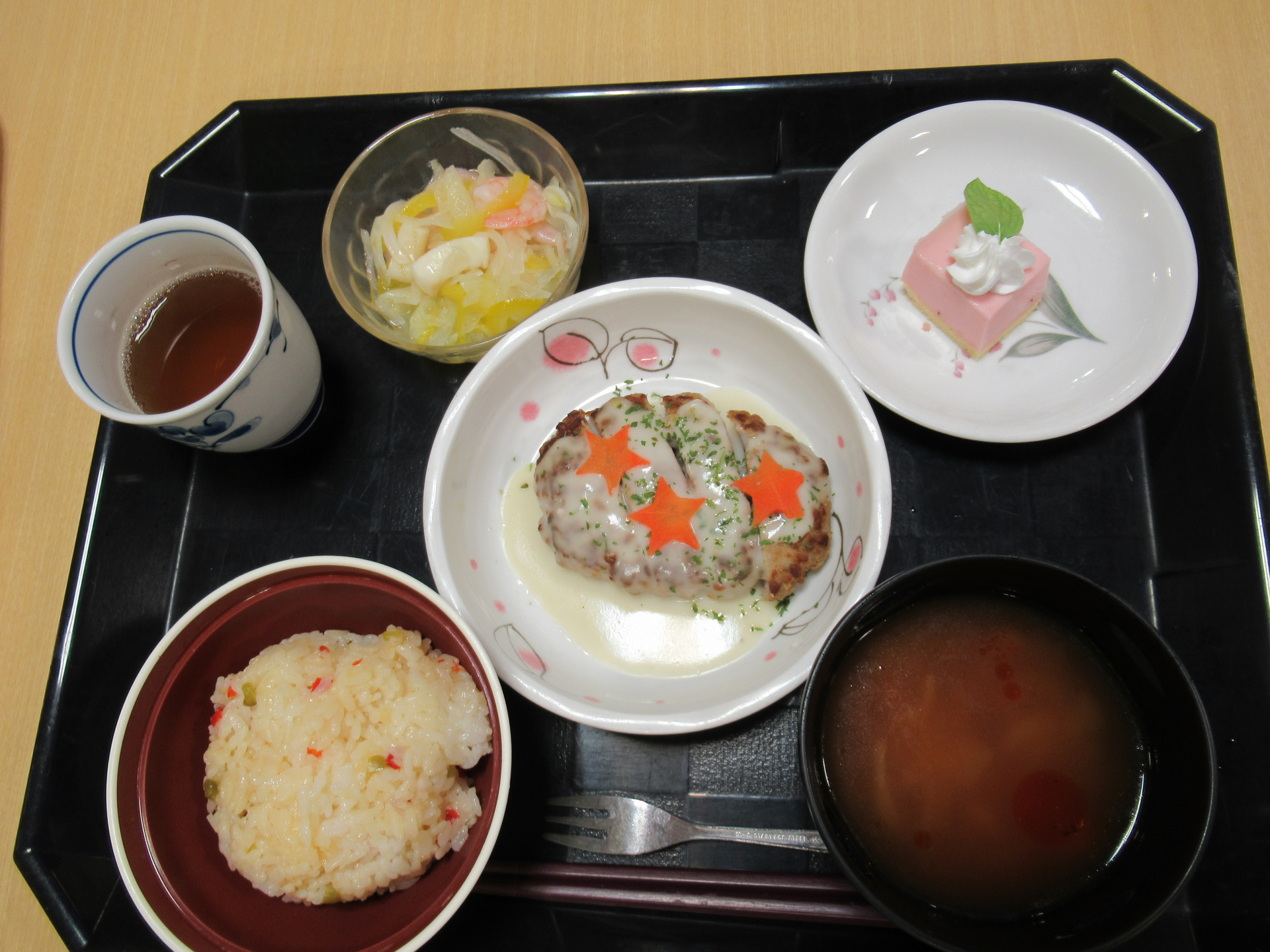 バターライス、クリスマスハンバーグ、シーフードマリネ、ミニケーキ、ミネストローネ