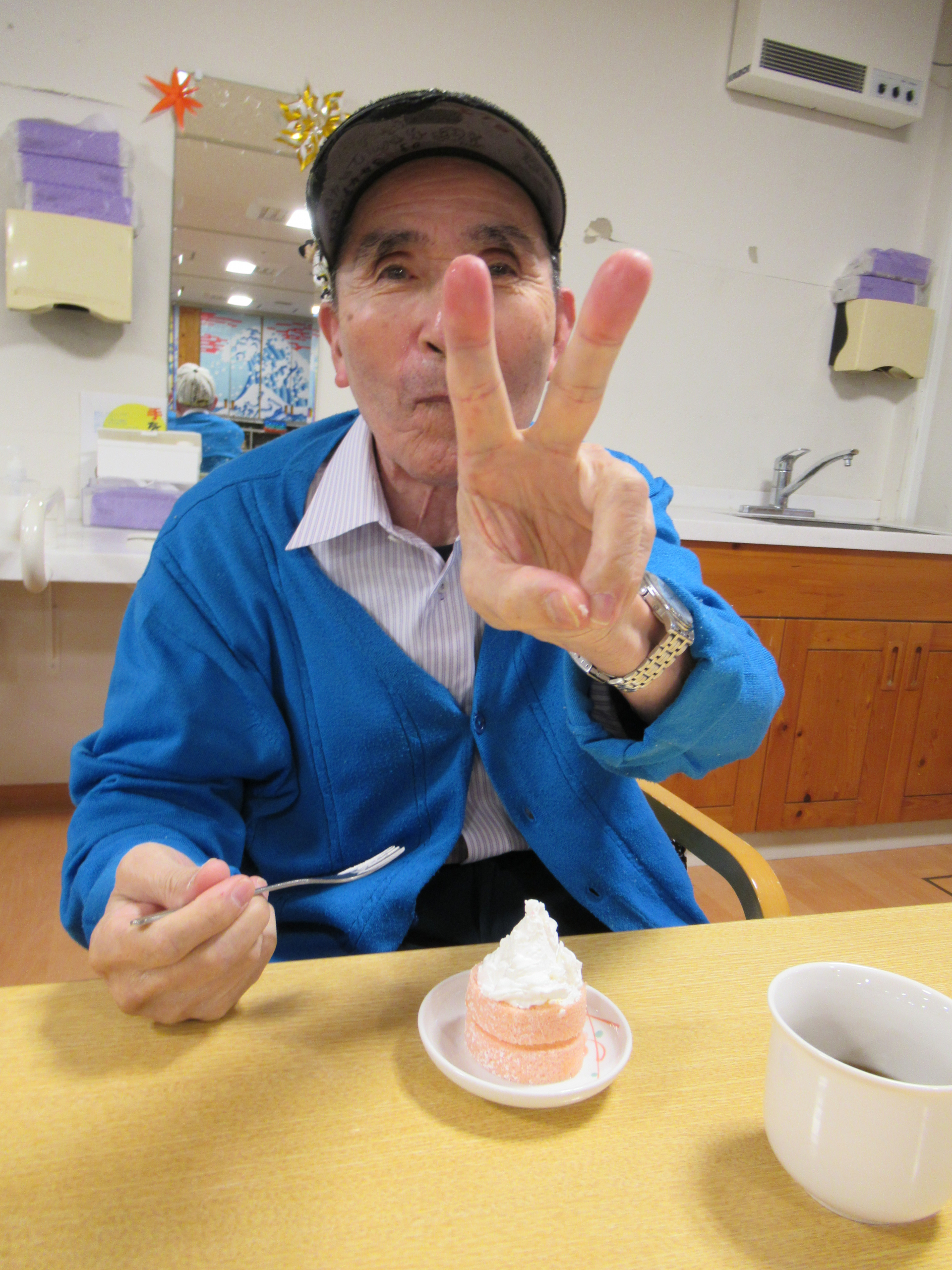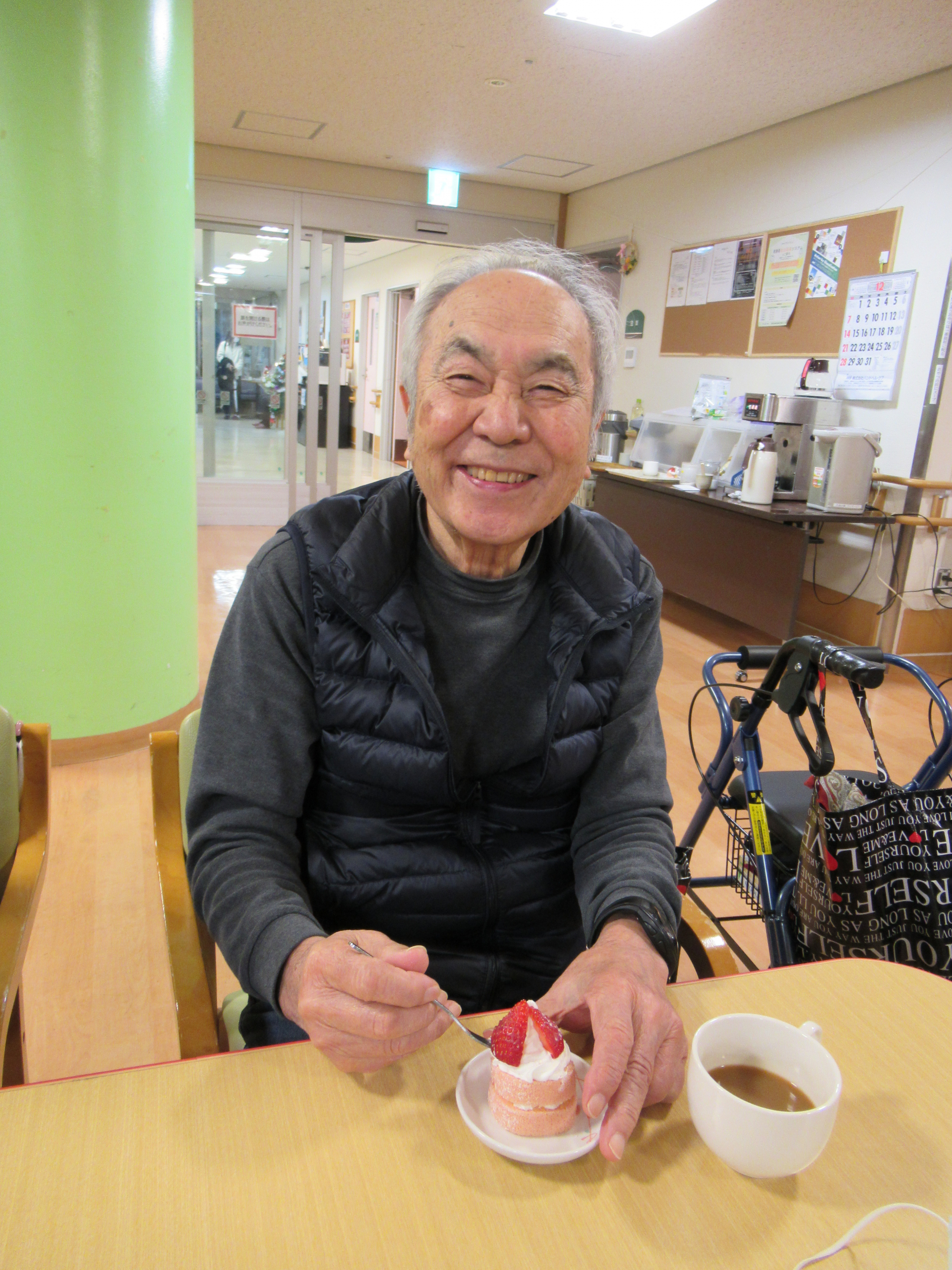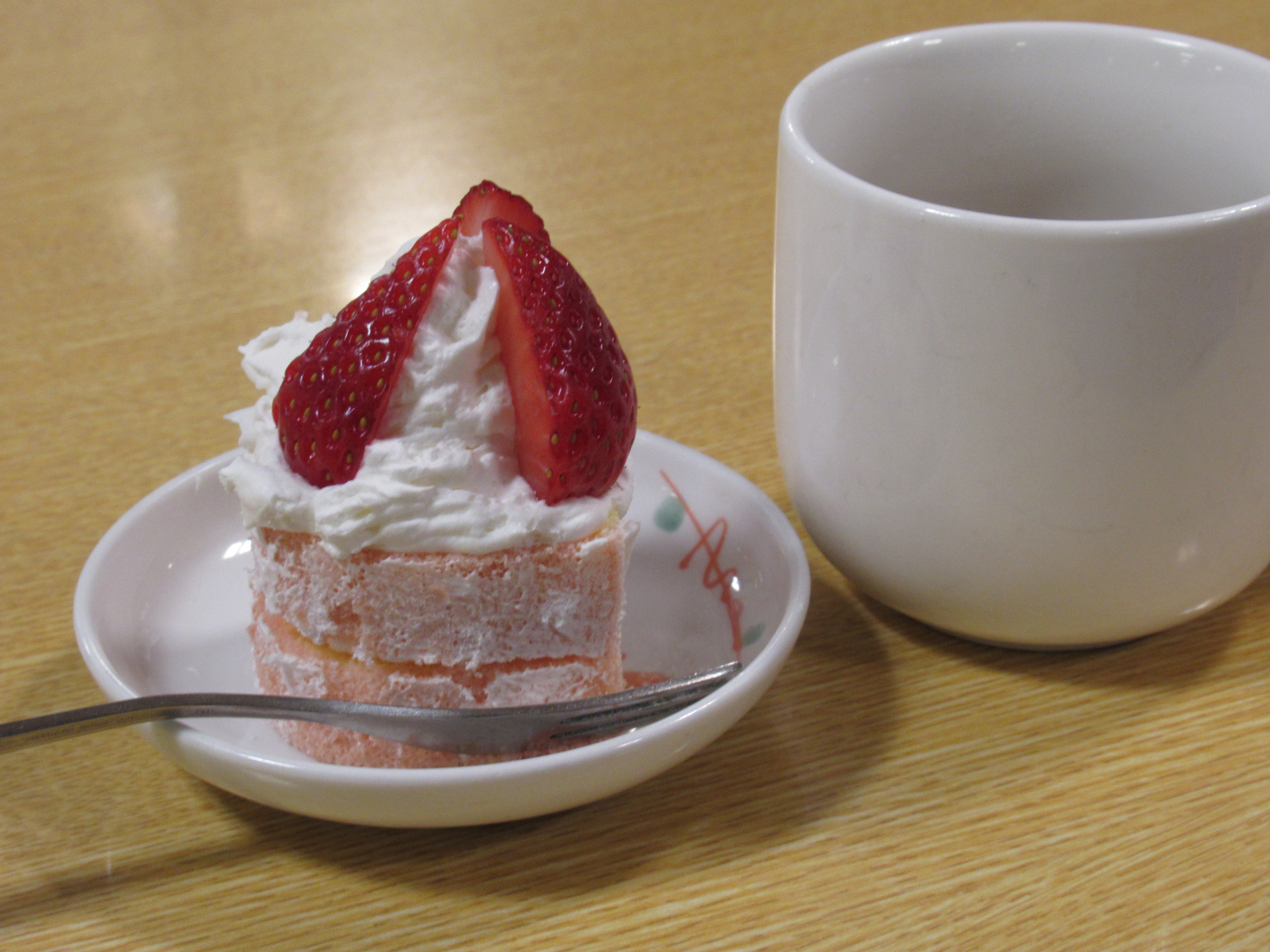 クリスマスイベント最後のお楽しみ三時のおやつは、コーヒー・紅茶に特製スイーツ。いちごのロールケーキに、生クリームとフレッシュないちごをのせました☆