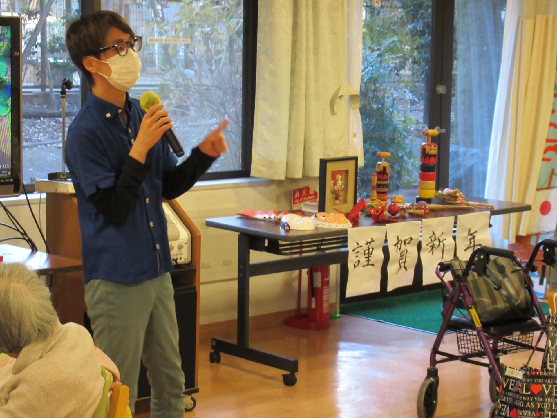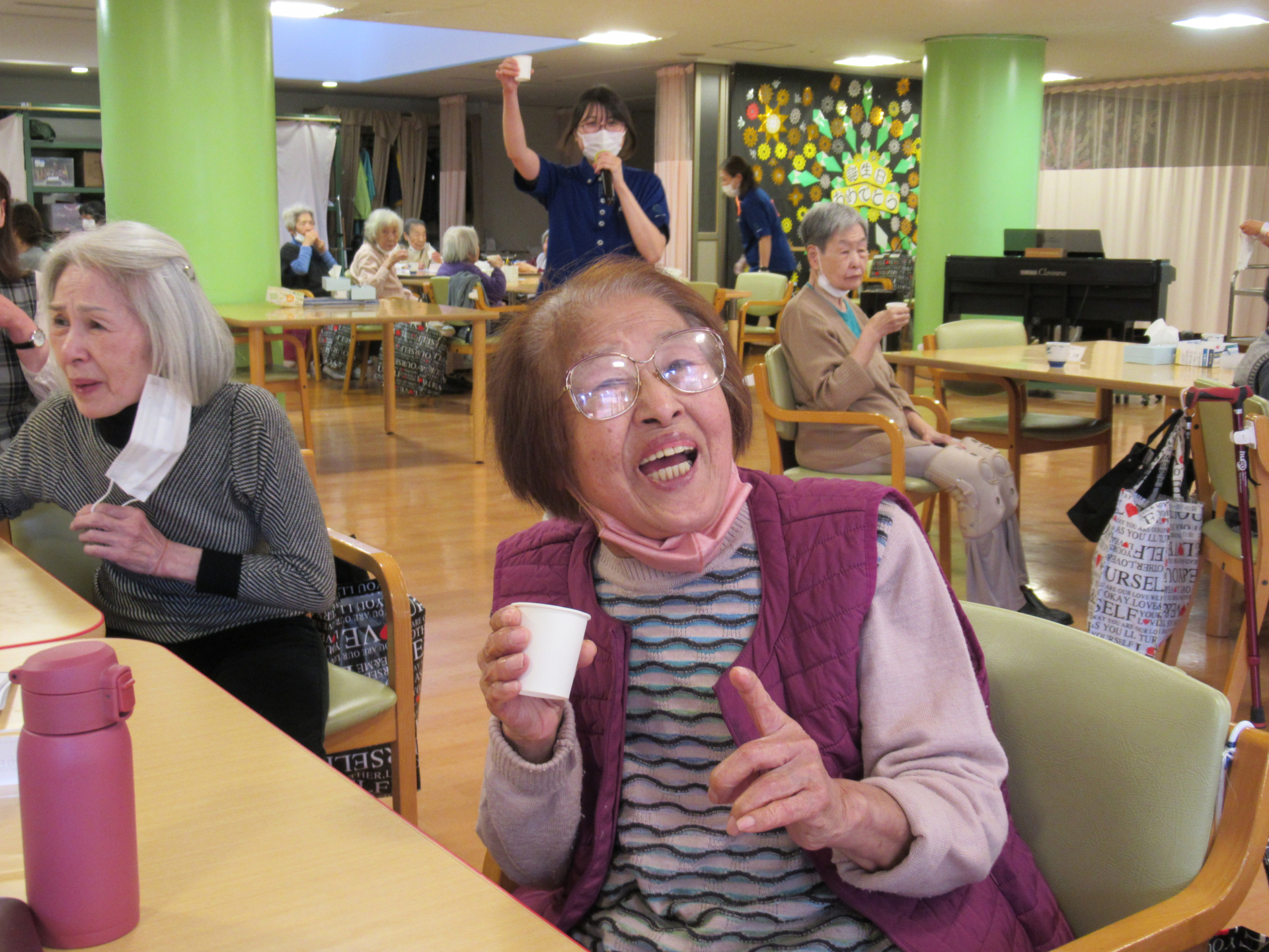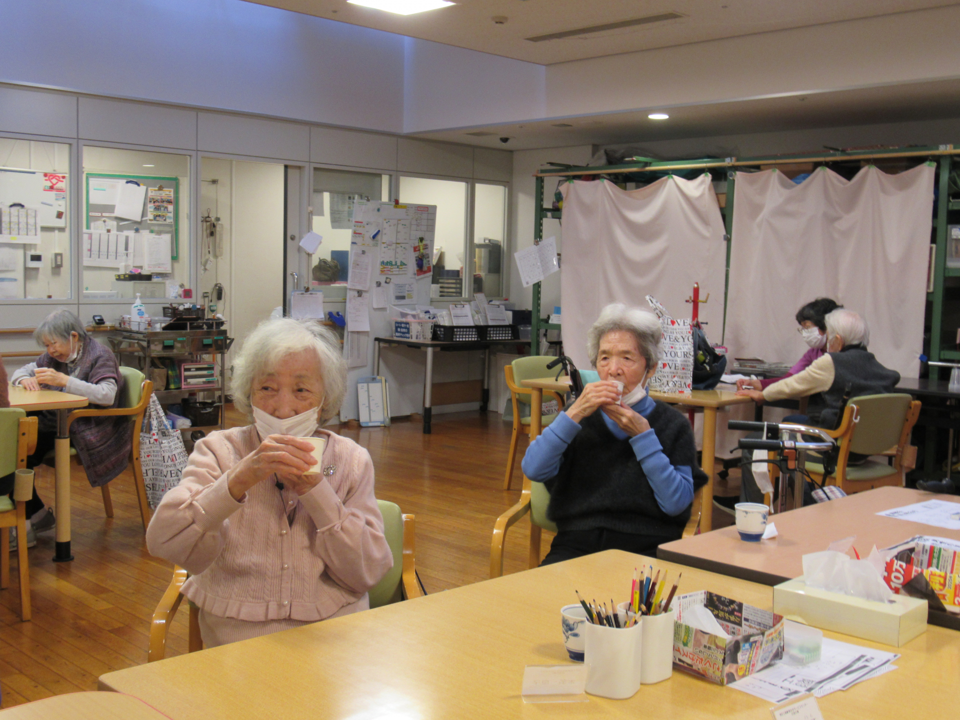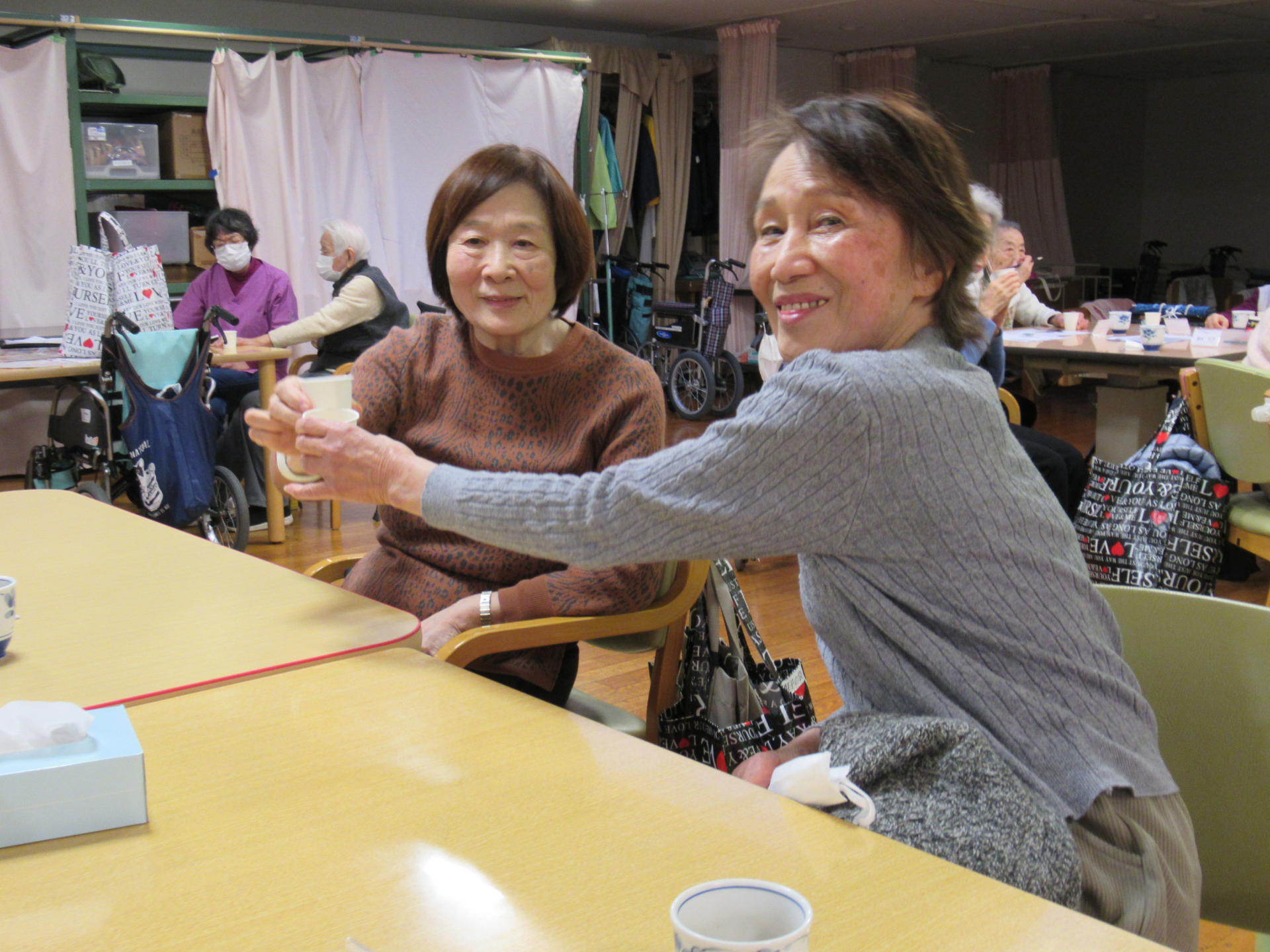 2026年「新年会」の今日、午後のレクリエーション前に白金の森デイサービス責任者・今野より新年のごあいさつと、みなさまと一緒に乾杯をさせていただきました!