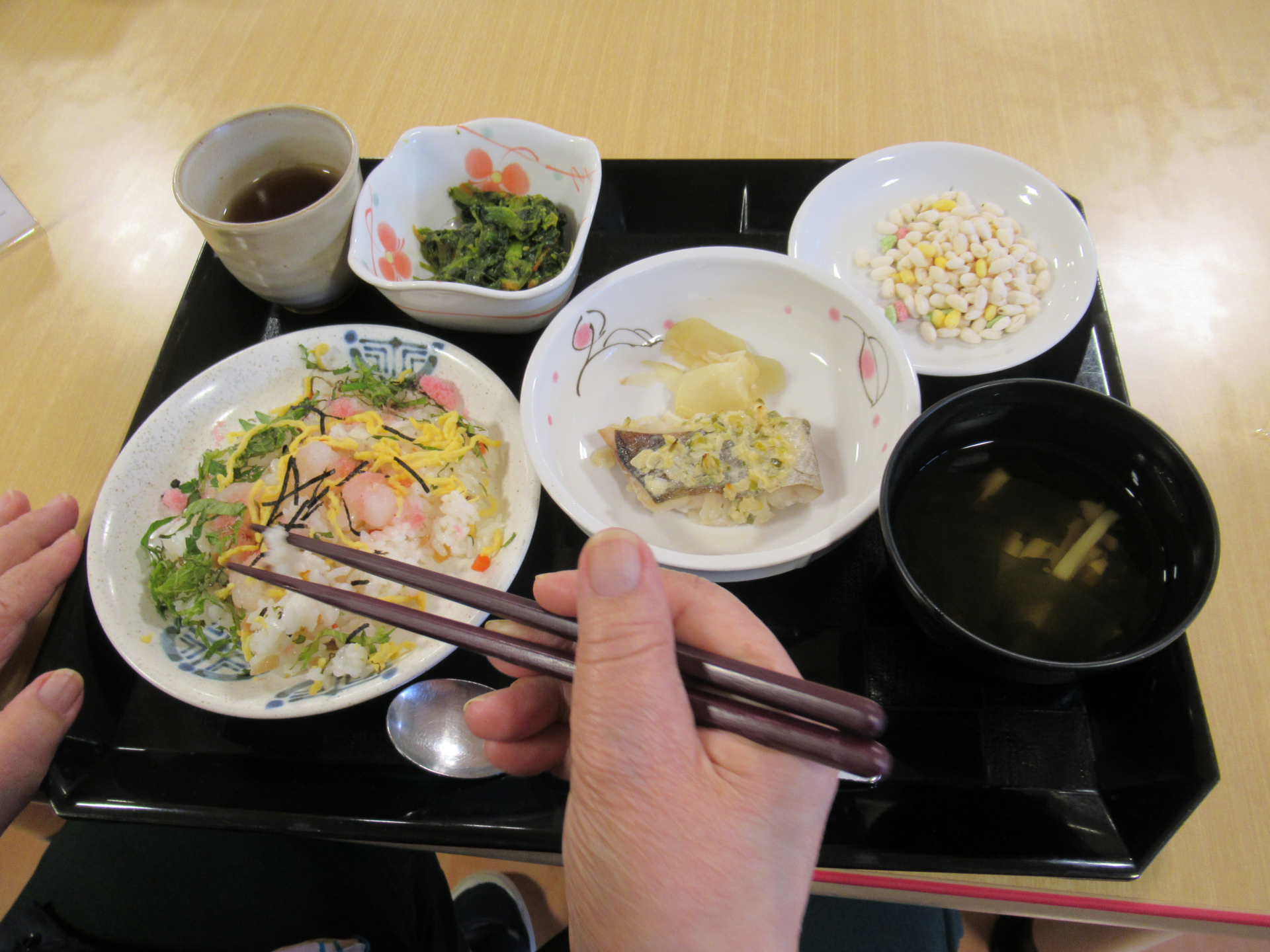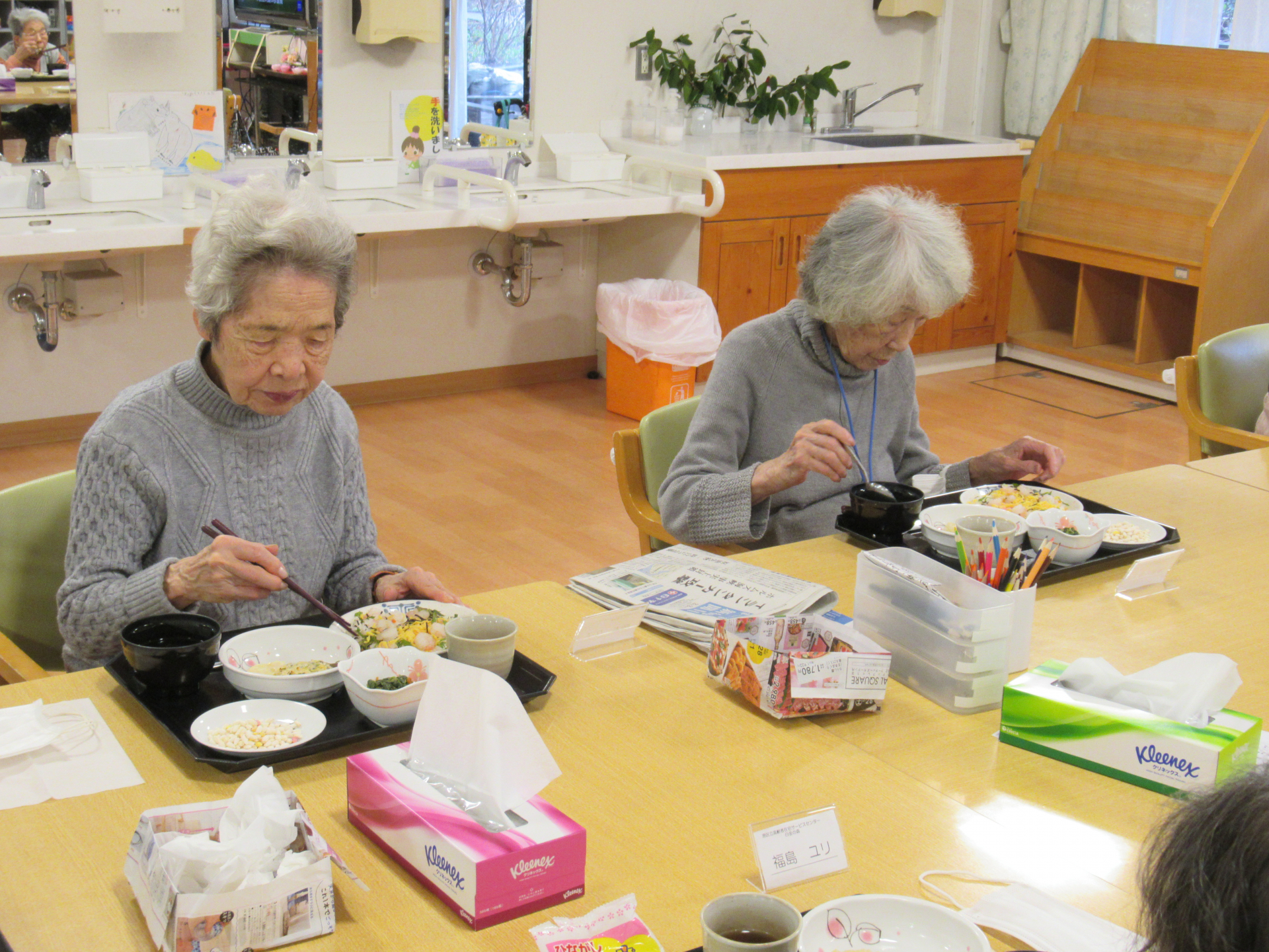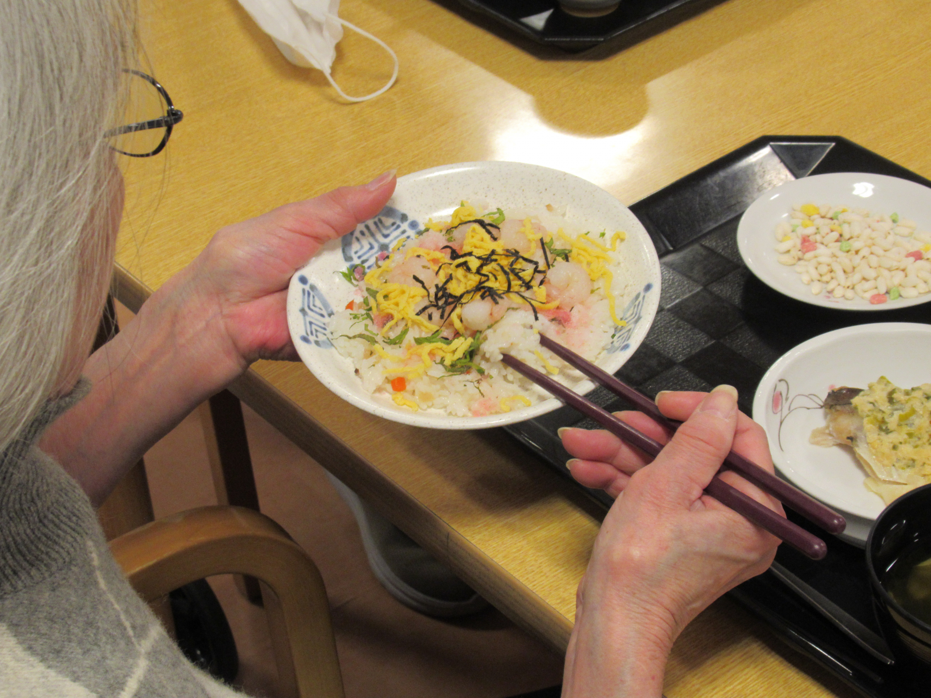 午後レク前に「今日のおちらし美味しかったよ~」と話しているご利用者もいて、春を感じるイベント食に季節を感じていただけたのではないでしょうか☆