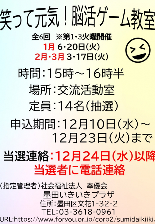 2025.12.20 NEW ペーパークイリングで作る箸袋 活動報告 2025.12.19 2026年の干支★うま 活動報告 2025.12.19 ⋆✴︎˚。⋆午の押絵作り講座⋆✴︎˚。⋆ 活動報告 2025.12.19 1月分を募集中★大人の小物作り教室 お知らせ 2025.12.16 お正月のしめ飾り 活動報告 2025.12.16 12月17日(水)は休館日です。 お知らせ 2025.12.16 素敵なクリスマスプレゼントを頂きました‼ 活動報告 2025.12.15 1月の予定表を発行しました。 お知らせ 2025.12.15 月だより1月号を発行しました。 お知らせ 2025.12.14 100回達成おめでとうございます♪ 活動報告 2025.12.14 元気に歩くための体操 ★募集中★ 活動報告 2025.12.14 笑って元気!脳活ゲーム教室 募集中 活動報告 2025.12.12 800回達成おめでとうございます! 活動報告 2025.12.09 イチョウがとてもキレイです☆.。.:*・゜ ニュース 2025.12.08 クリスマスツリーを飾りました。゚゚*↟⍋↟*。゚。 ニュース 1 2 3 … 43