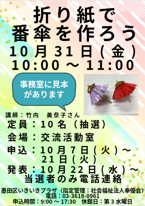 2025.10.16 月だより11月号を発行しました。 お知らせ 2025.10.14 10月15日(水)は休館日です。 お知らせ 2025.10.12 食欲の秋★ 活動報告 2025.10.11 グリスロからの景色★ ニュース 2025.10.11 シュウカイドウ✿ ニュース 2025.10.10 お子様達と一緒に体操・お昼ご飯食べに行ってきました!!!! 活動報告 2025.10.10 10月の額絵です。 ニュース 2025.10.07 折り紙で番傘を作ってみませんか? お知らせ 2025.10.07 『着付け何でも相談室』を開催します。 お知らせ 2025.10.05 今月のお花です✿ ニュース 2025.10.05 儚い夕顔★ ニュース 2025.10.04 グリーンスローモビリティ‼ 活動報告 2025.10.04 カラフルなクジャク★ 活動報告 2025.10.03 利用者さんを乗せてスローに走行中! 活動報告 2025.10.03 笑って元気!脳活ゲーム教室 活動報告 1 2 3 4 … 40