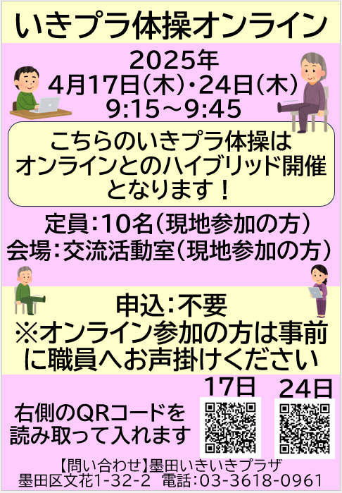4月17日・24日(木)9:15~9:45に『いきプラ体操オンライン』を開催します。