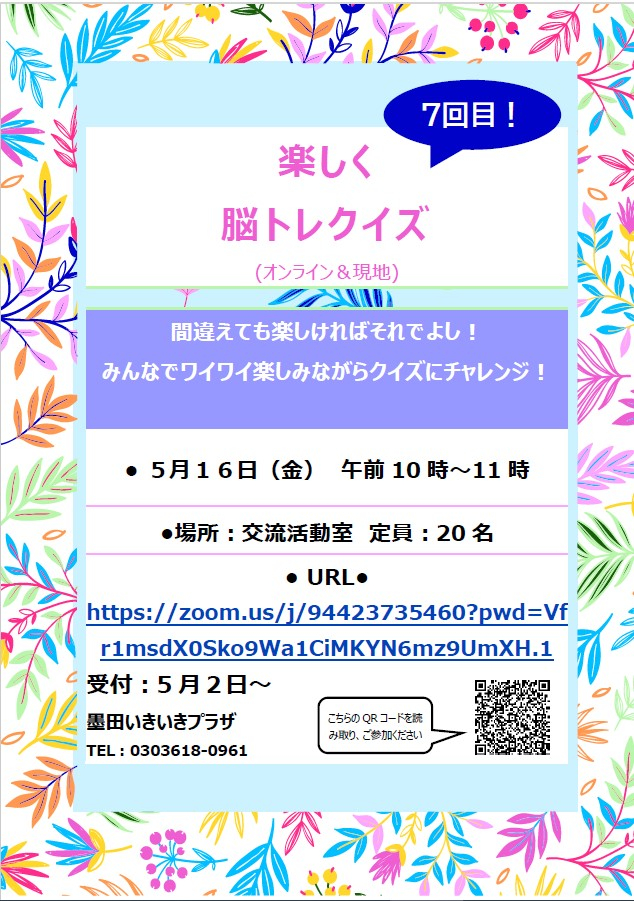 楽しく脳トレクイズ 5/16㈮10時~11時 開催の募集を