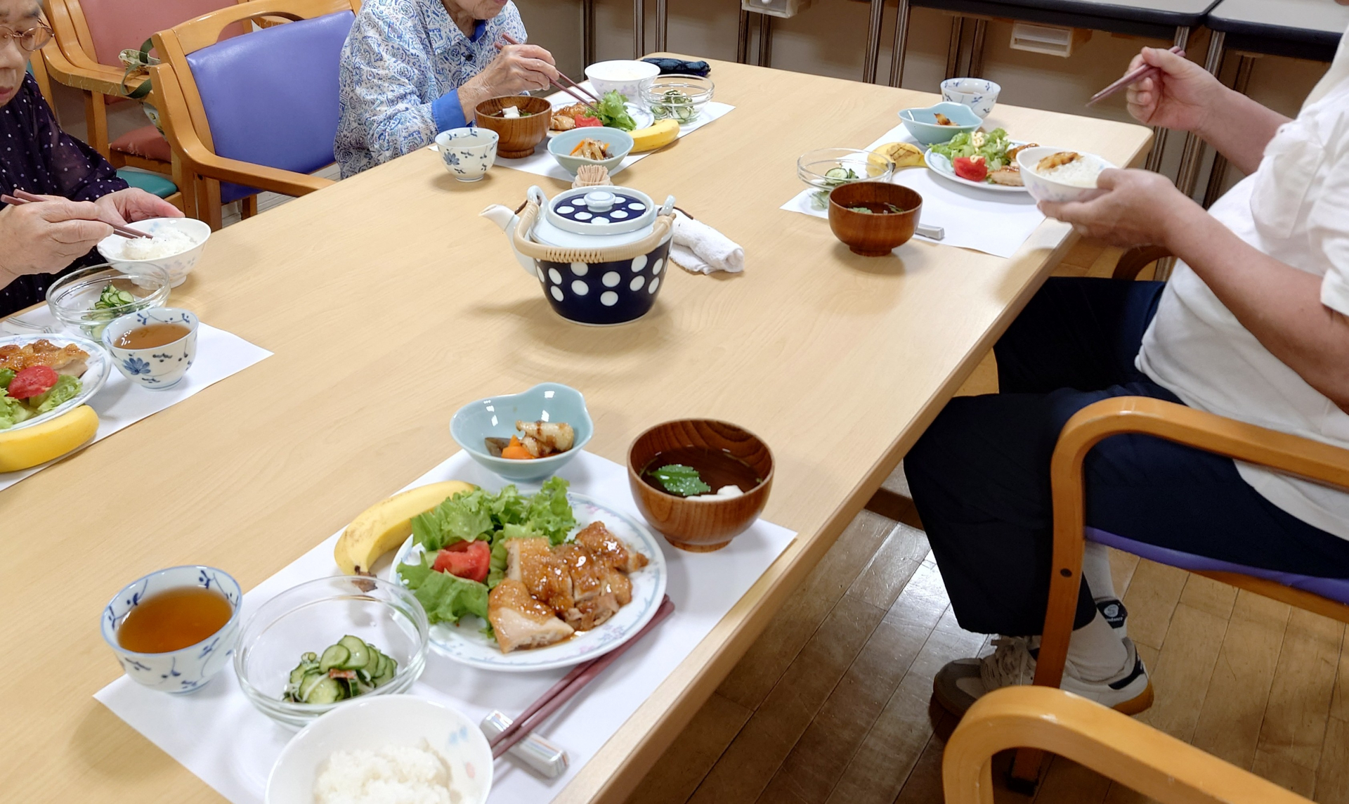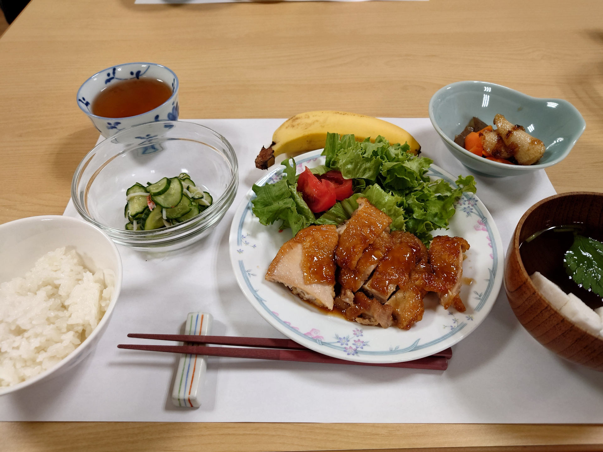 この日のメニューは鶏の照り焼き・煮物・きゅうりの酢の物・すまし汁・バナナ。
