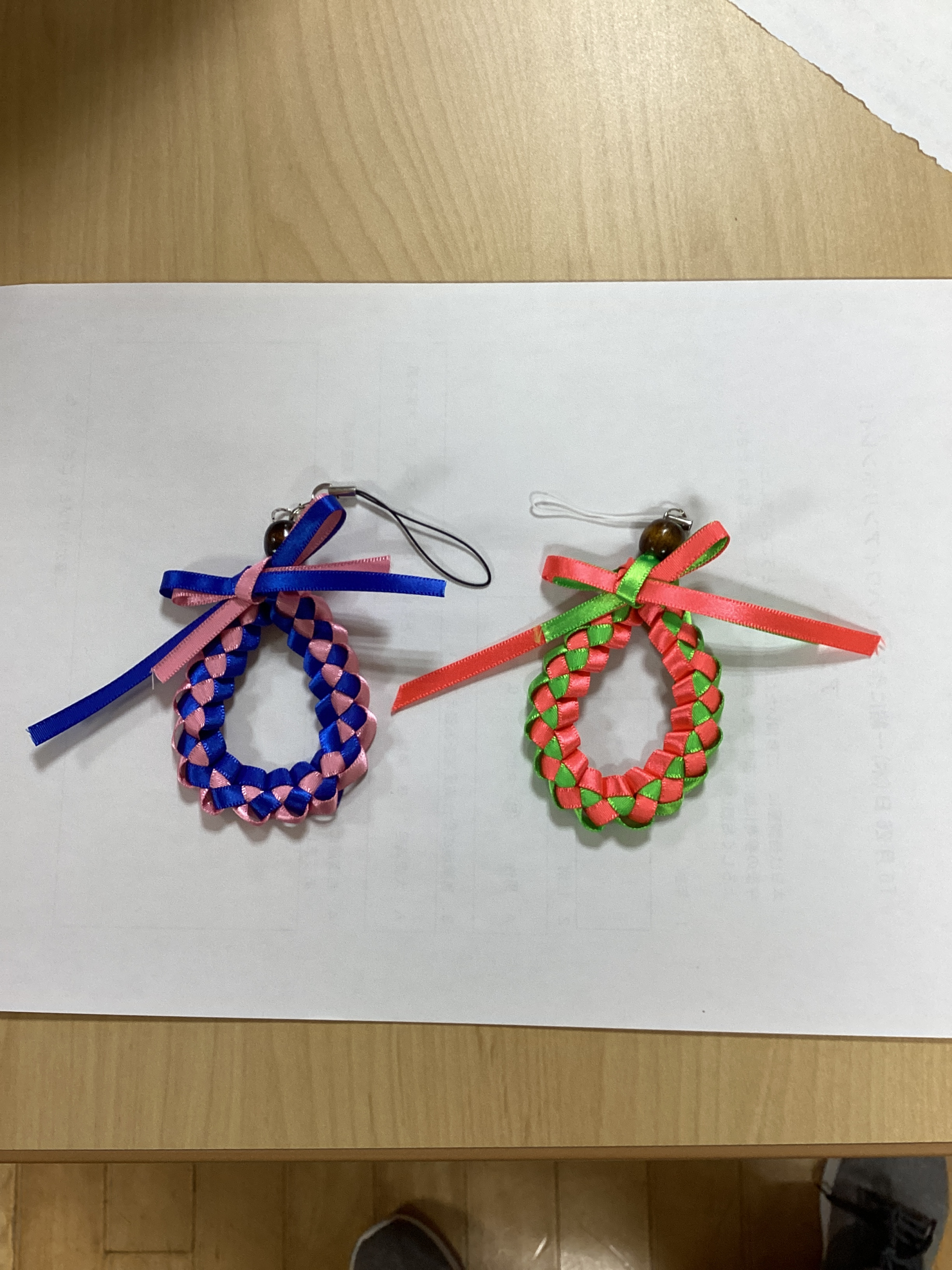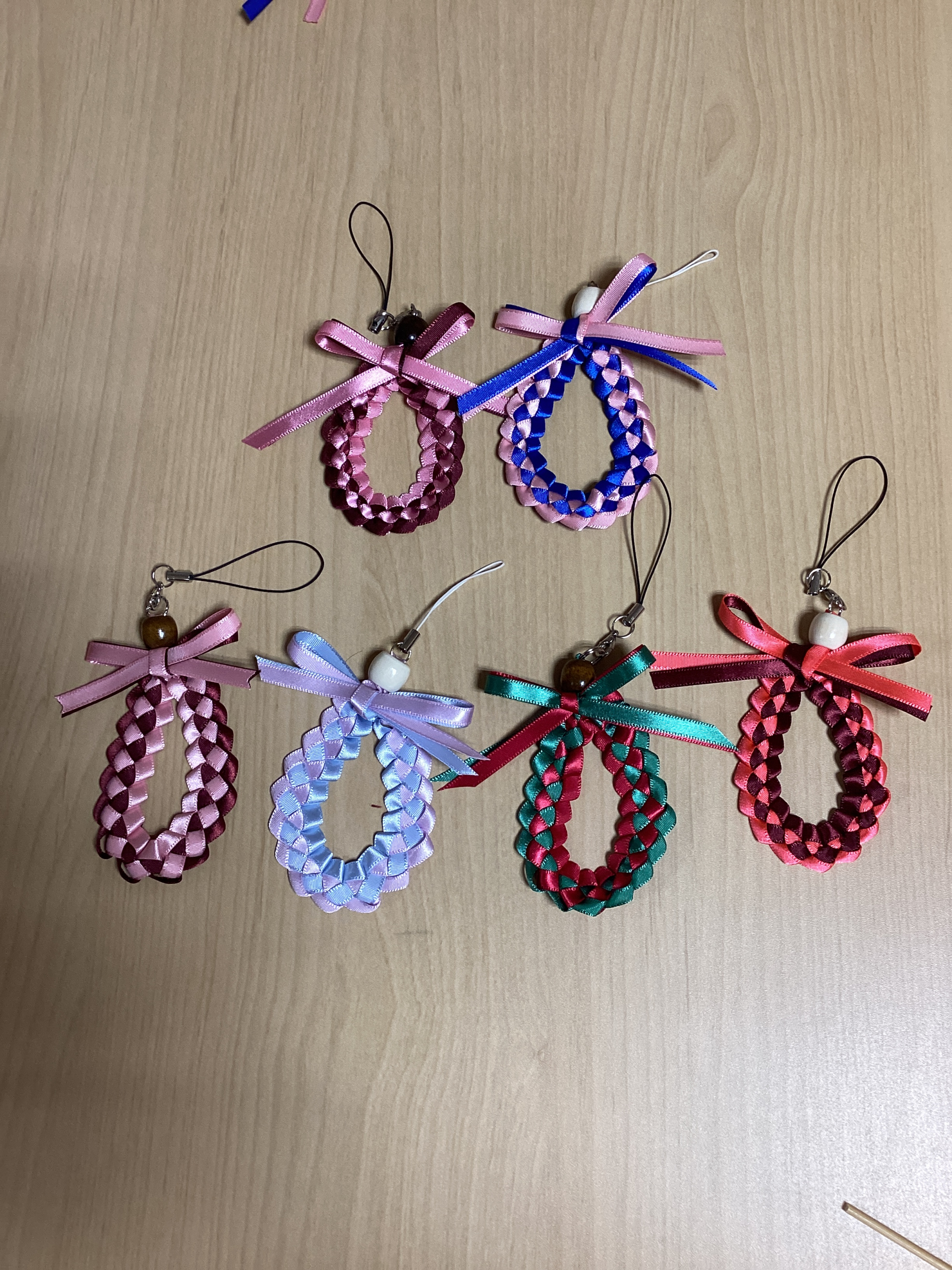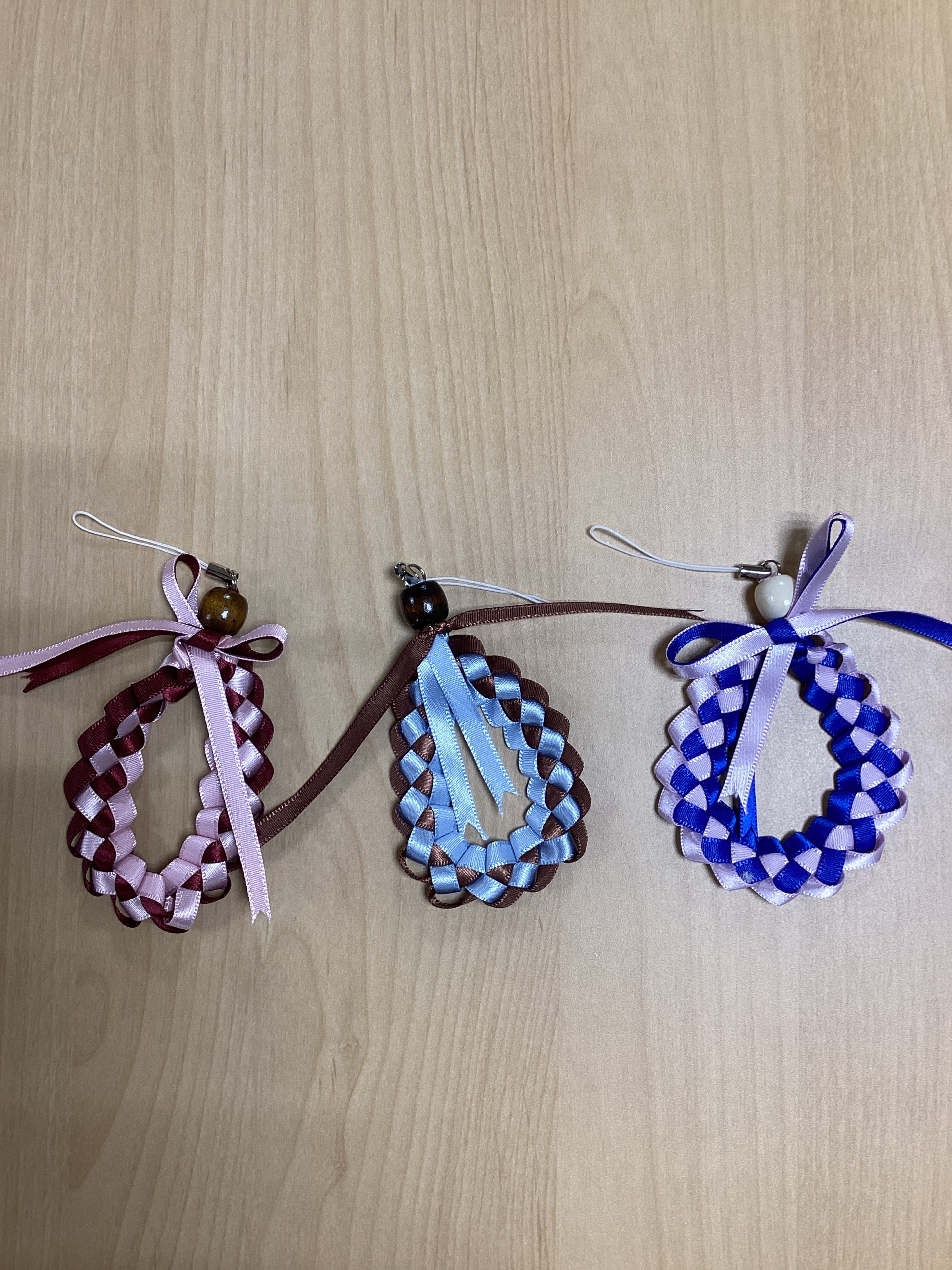 好きな色のリボンを2色選んで編んで結び、根付けも付ければ出来上がり!