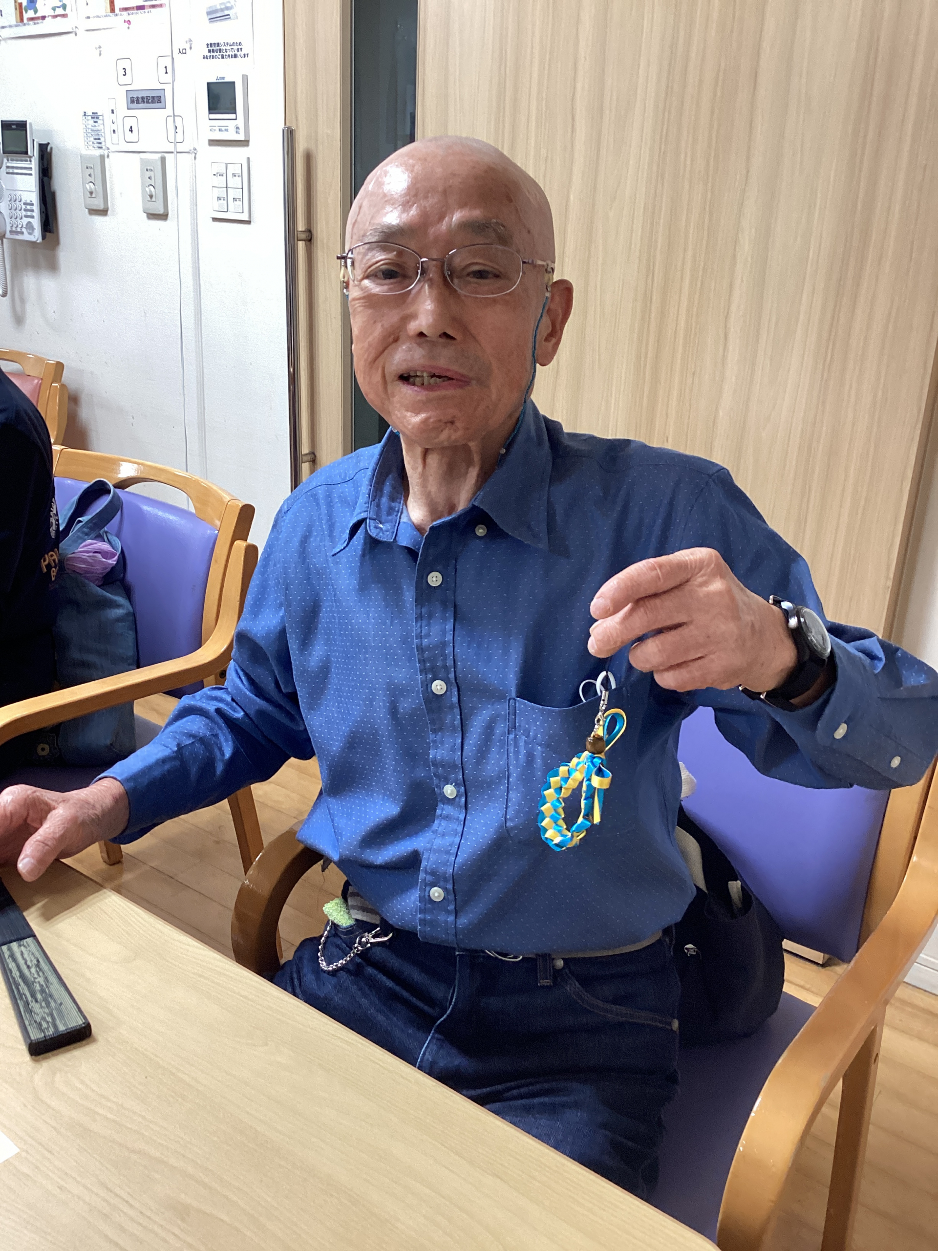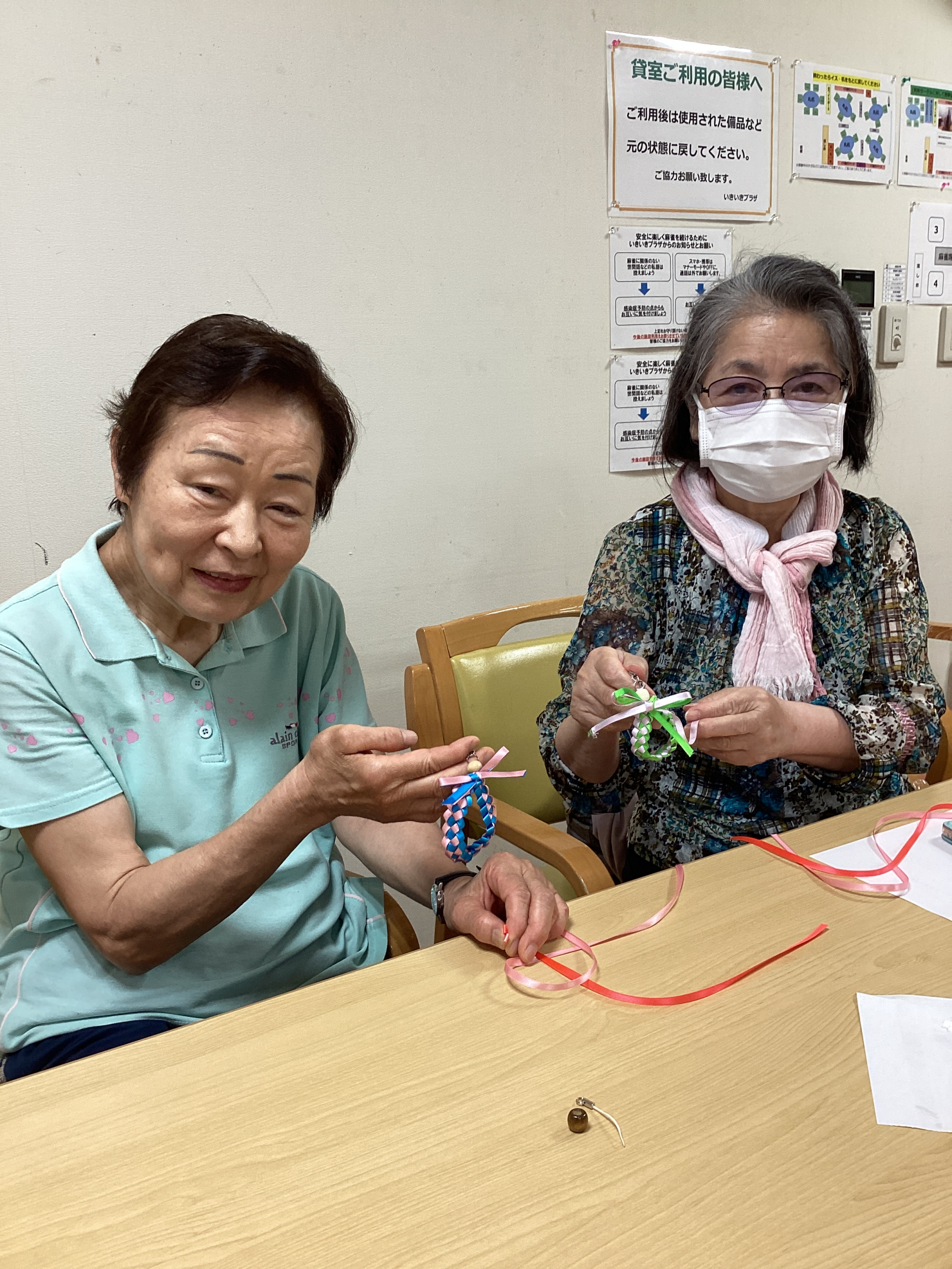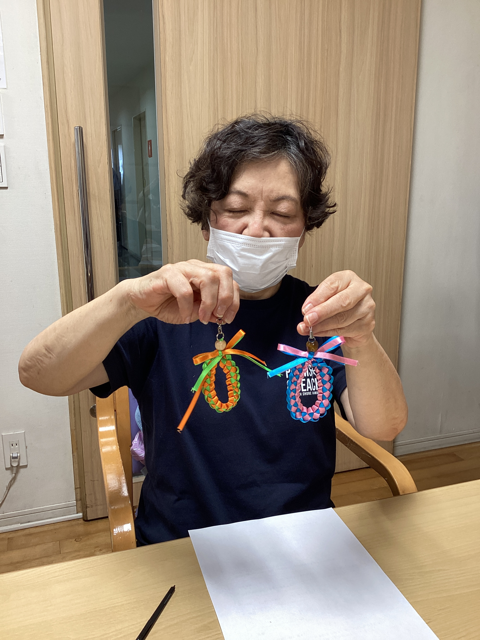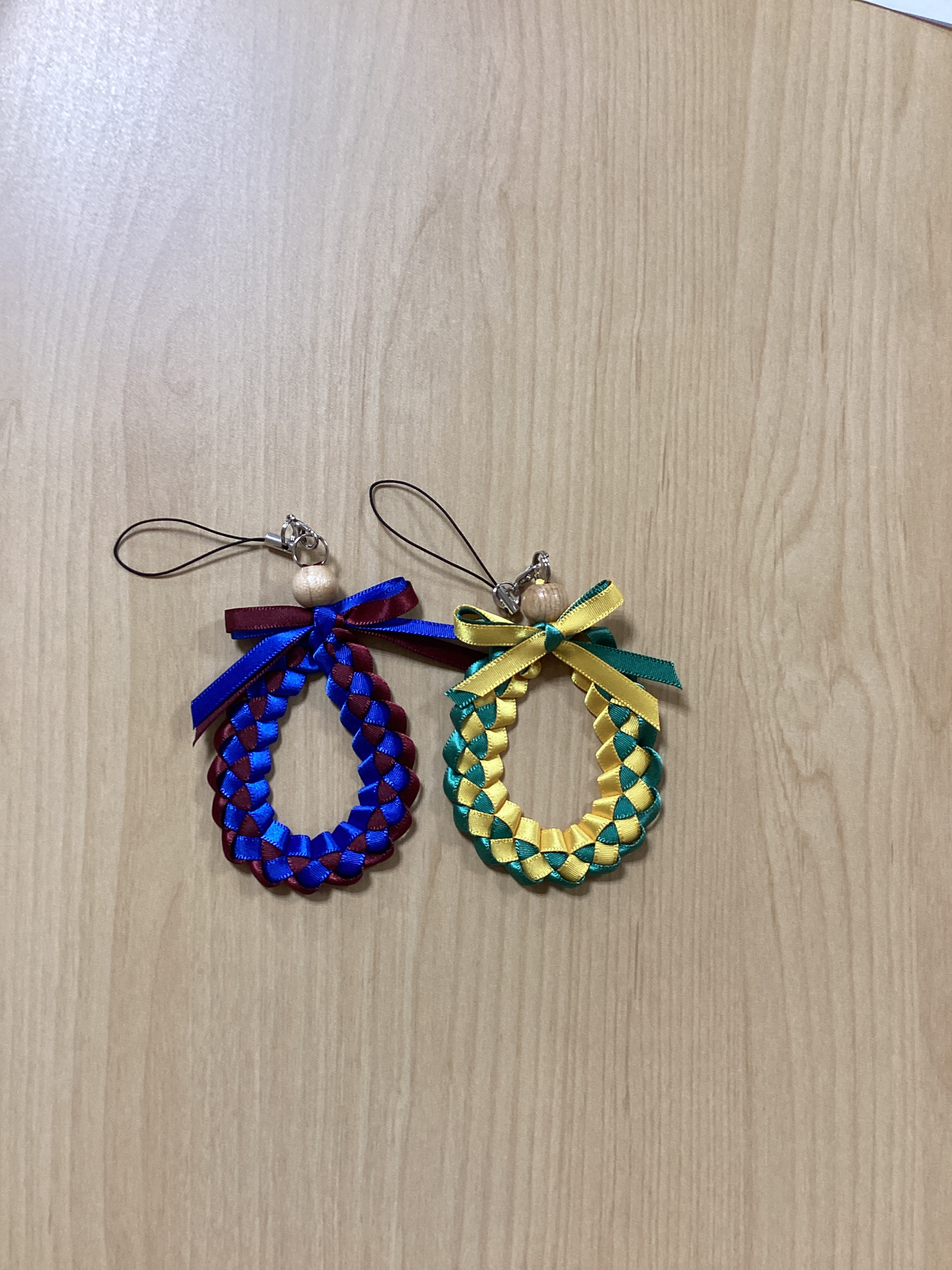 好きな色のリボンを2色選んで編んで結び、根付けも付ければ出来上がり!