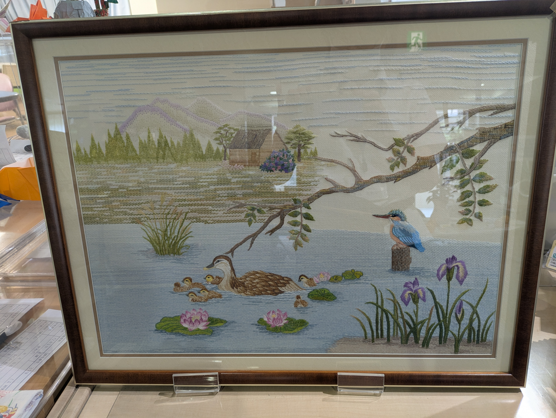 愛くるしいカルガモ親子を艶やかなカワセミが見守る、涼しげな川辺。刺繍の作品です。