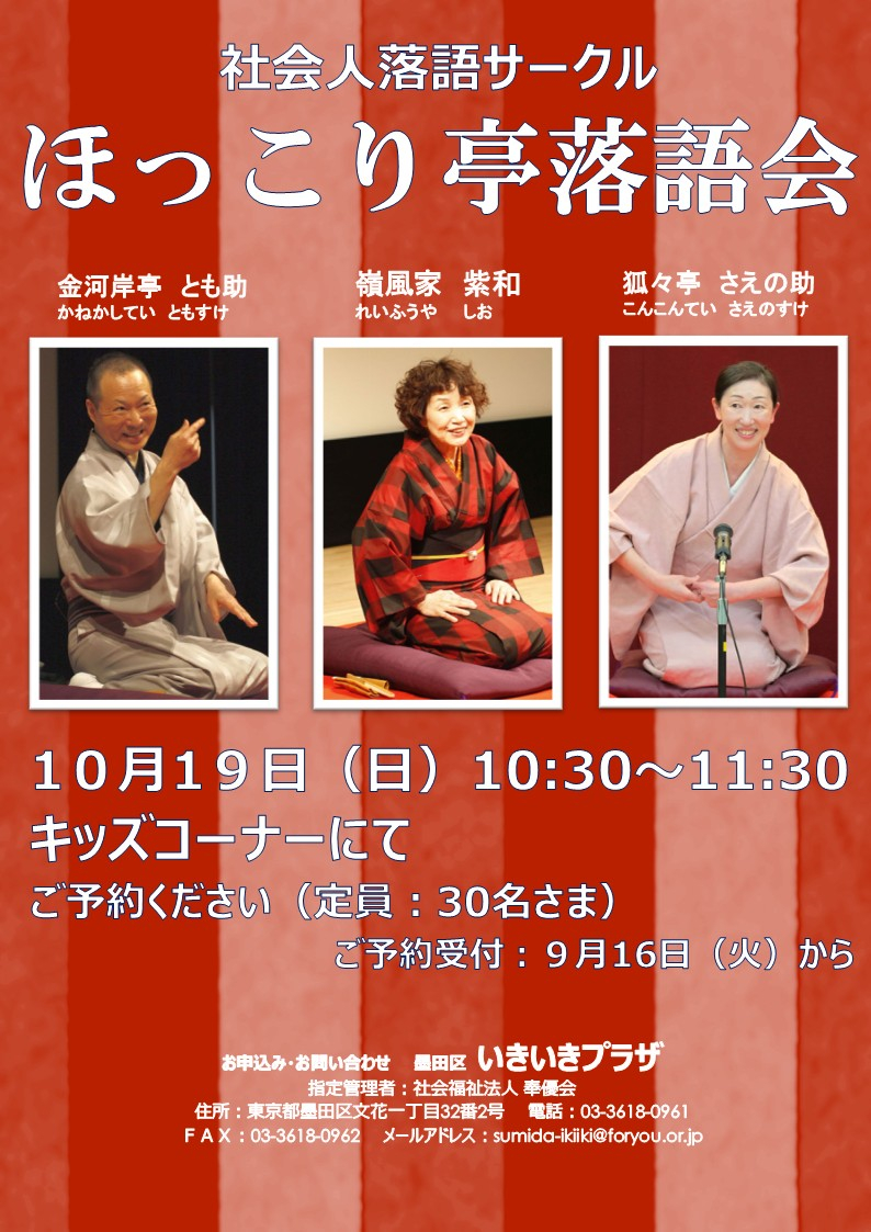 2025.09.16 活動報告 ほっこり亭落語会 10月19日開催決定☆ Tweet シェアする ほっこり亭落語会 10月19日㈰ 10:30-11:30にて 開催決定しました (^_-)-☆ 本日より定員30名さまで募集しております!!!! 墨田いきいきプラザ F・I 前の記事 2025.09.16 活動報告 9月17日(水)は休館日です。 次の記事 2025.09.15 活動報告 元気に歩くための体操 募集開始です✨ 一覧へ戻る