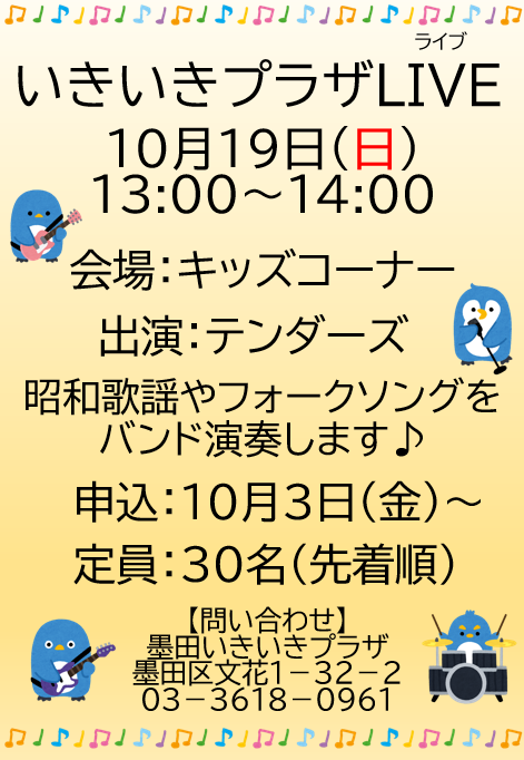 10月19日(日)13:00~14:00に『いきいきプラザLIVE』を開催します。