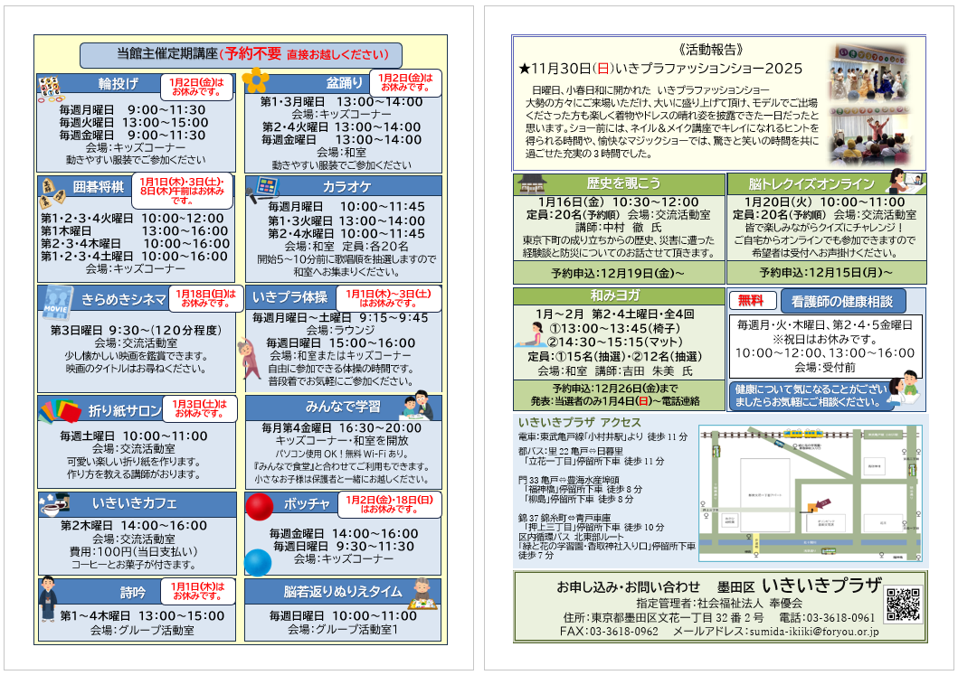 2025.12.15 お知らせ 月だより1月号を発行しました。 Tweet シェアする 月だより1月号を発行しました。 月だより1月号を発行しました。 下記のリンクから詳細をご覧できます。 月だより1月号 墨田いきいきプラザ yuriko. 一覧へ戻る