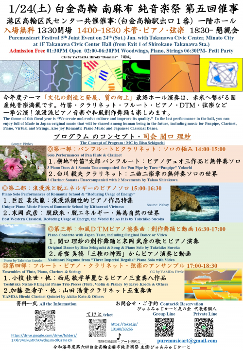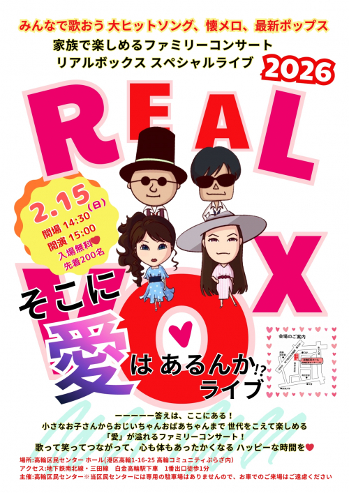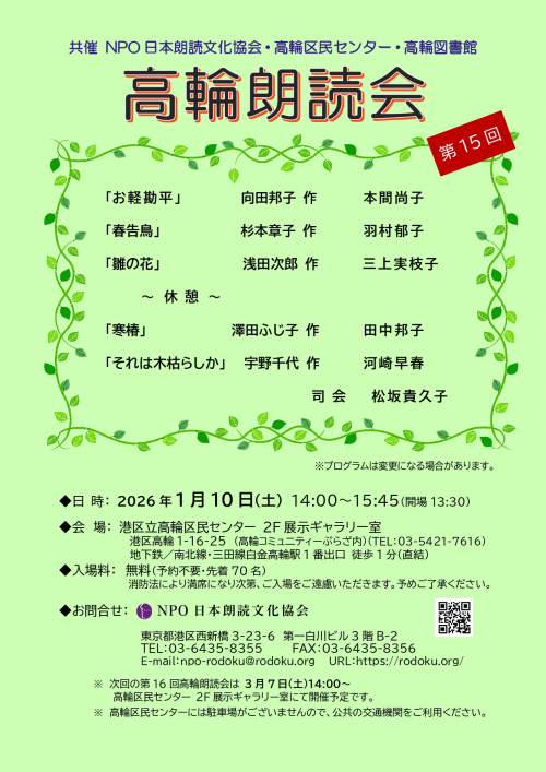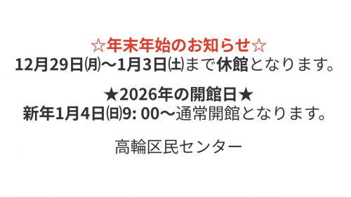 2026.01.27 Maya先生 整う一年の始まり めぐりを促す冬の顔ヨガ と リラックスヨガ (午前編)開催しました。 活動報告 2026.01.25 1月25日~1月31日 港区予約システム抽選予約期間 お知らせ 2026.01.23 Maya先生 整う一年の始まり めぐりを促す冬の顔ヨガ と リラックスヨガ 開催しました。 活動報告 2026.01.20 2月28日(土)10時~11時 0歳からのコンサート 早春に響く未来への歌声 開催予定です。 お知らせ 2026.01.20 2月27日(金)10時半~ 音と遊ぶリトミック♬ ゆーきやこんこん寒いのとんでけ! 開催予定です。 お知らせ 2026.01.20 わんちゃんに読み聞かせ Read With The Dog 開催しました。 活動報告 2026.01.20 音と遊ぶリトミック♬ お正月あそびでリトミック♪を開催しました。 活動報告 2026.01.19 2月15日(日) REAL VOXのスペシャルライブ2026が開催されます。 お知らせ 2026.01.19 2月14日(土) たかなわえほんのひろば(読み聞かせ)を開催いたします。 お知らせ 2026.01.19 3月7日㈯ 14:00~ 第16回 高輪朗読会を開催いたします。 お知らせ 2026.01.18 第15回 高輪朗読会が開催されました。 活動報告 2026.01.18 白金高輪南麻布 純音楽祭 第五回催事 お知らせ 2026.01.01 1月12日(月・祝)は高輪区民センターの臨時休館日です。 お知らせ 2026.01.01 港区施設予約システムに関するご案内とお支払について お知らせ 2025.12.25 年末年始休館のお知らせ 12月29日㈪~1月3日㈯まで休館 新年1月4日㈰から開館 お知らせ 1 2 3 … 21