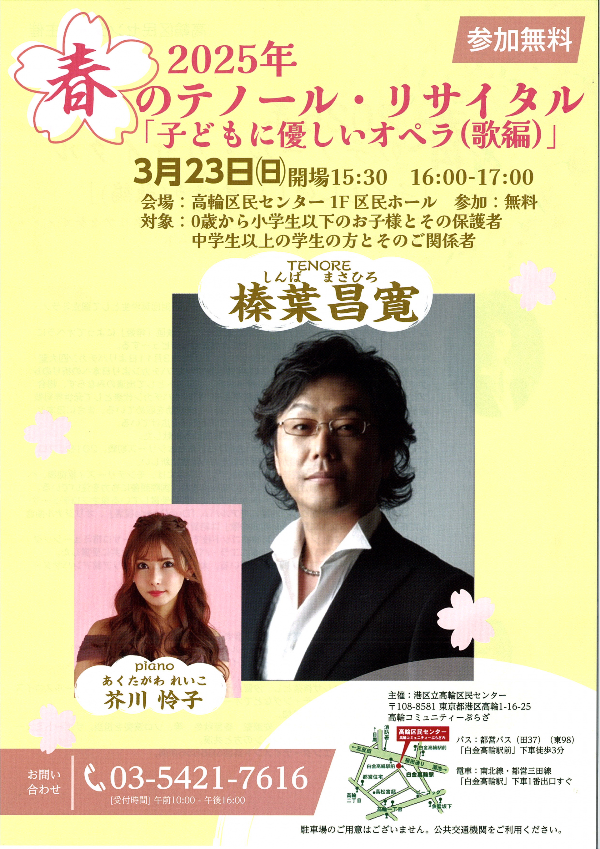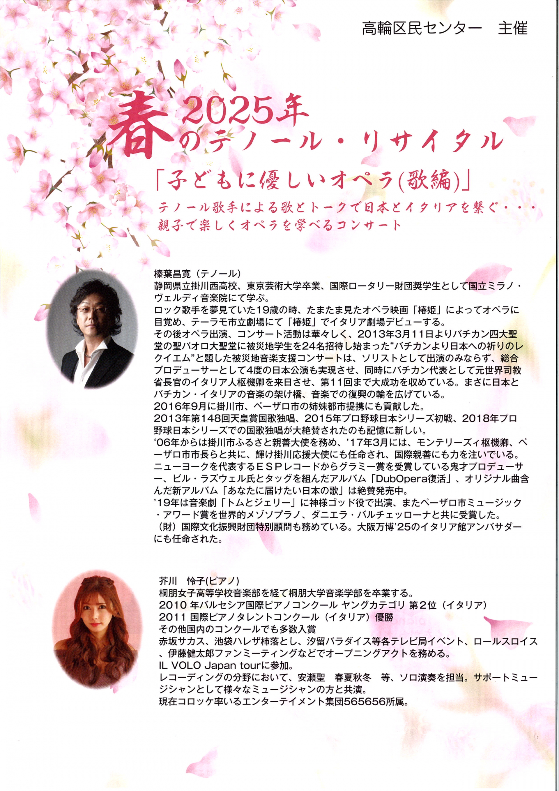 出 演:榛葉 昌寛(テノール歌手)・芥川 怜子(ピアノ演奏)