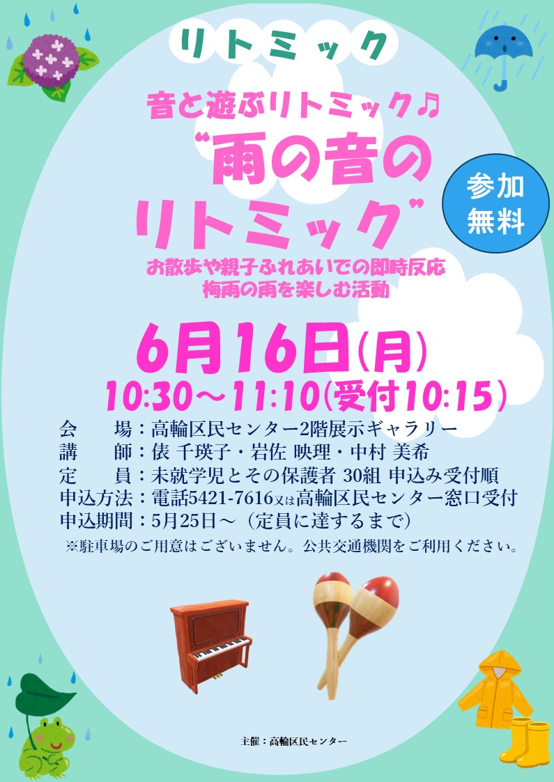 6月16日㈪ 10:30~ 音と遊ぶリトミック 雨の音のリトミック 開催予定です。