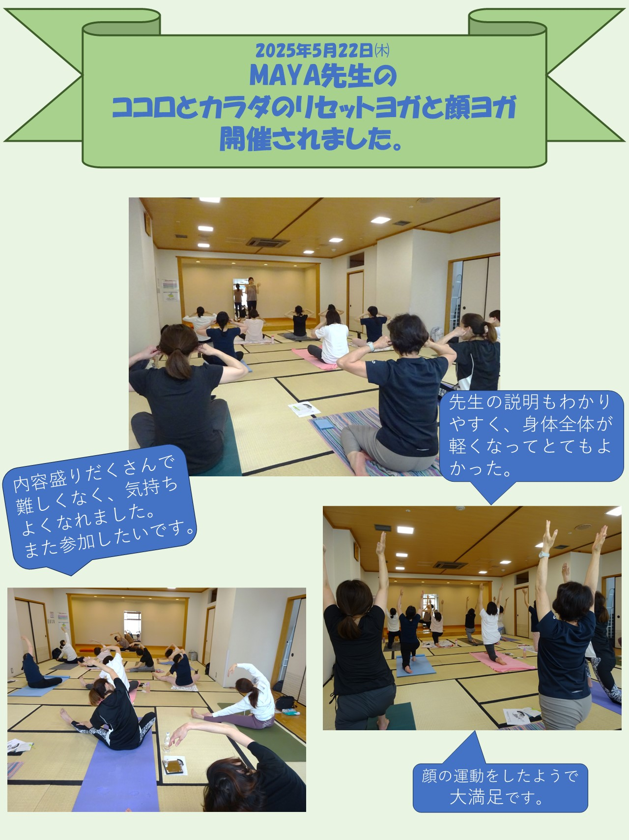 2025.05.22 活動報告 MAYA先生 ココロとカラダのリラックスヨガと顔ヨガ 開催されました! Tweet シェアする Maya先生ココロとカラダのリセットヨガと顔ヨガ (午前中の部) 開催されました! 高輪区民センター 担当:高橋 前の記事 2025.05.25 活動報告 5月25日~5月31日 港区予約システム抽選予約期間 次の記事 2025.05.16 活動報告 【NEO水彩スケッチ会展】開催中! 一覧へ戻る