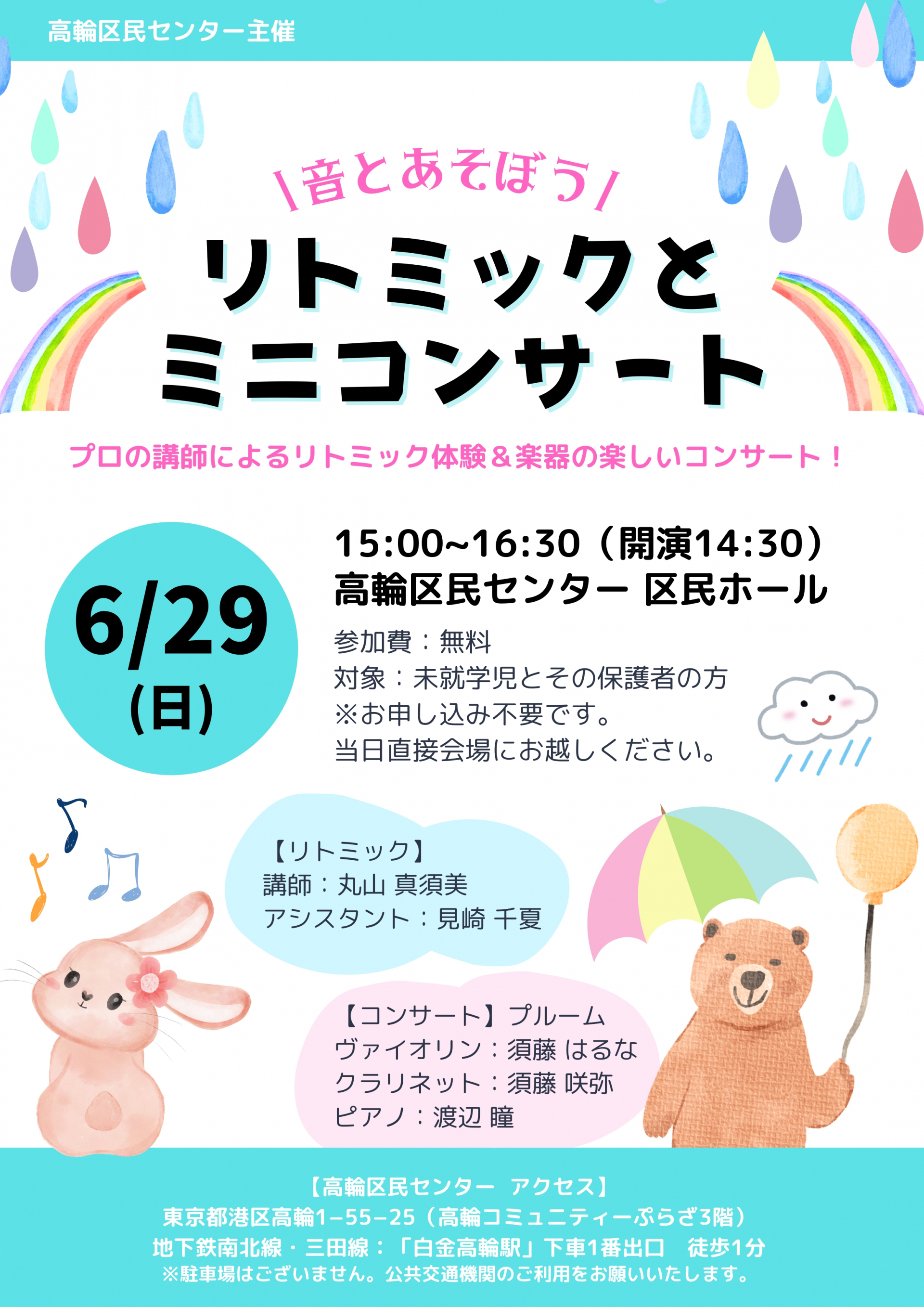 6月29日㈰ 15:00~ 「音と遊ぼう!リトミックとコンサート」開催されます♬