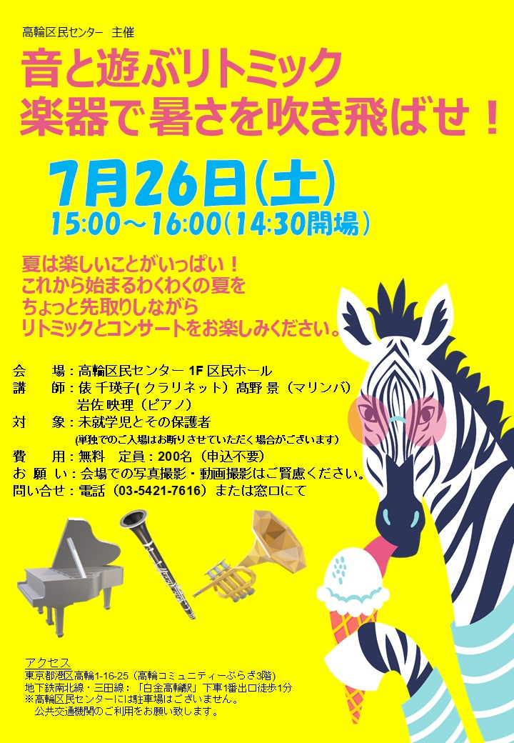 7月26日(土) 15:00~ 「音と遊ぶリトミック 楽器で暑さを吹き飛ばせ!」が開催されます♬