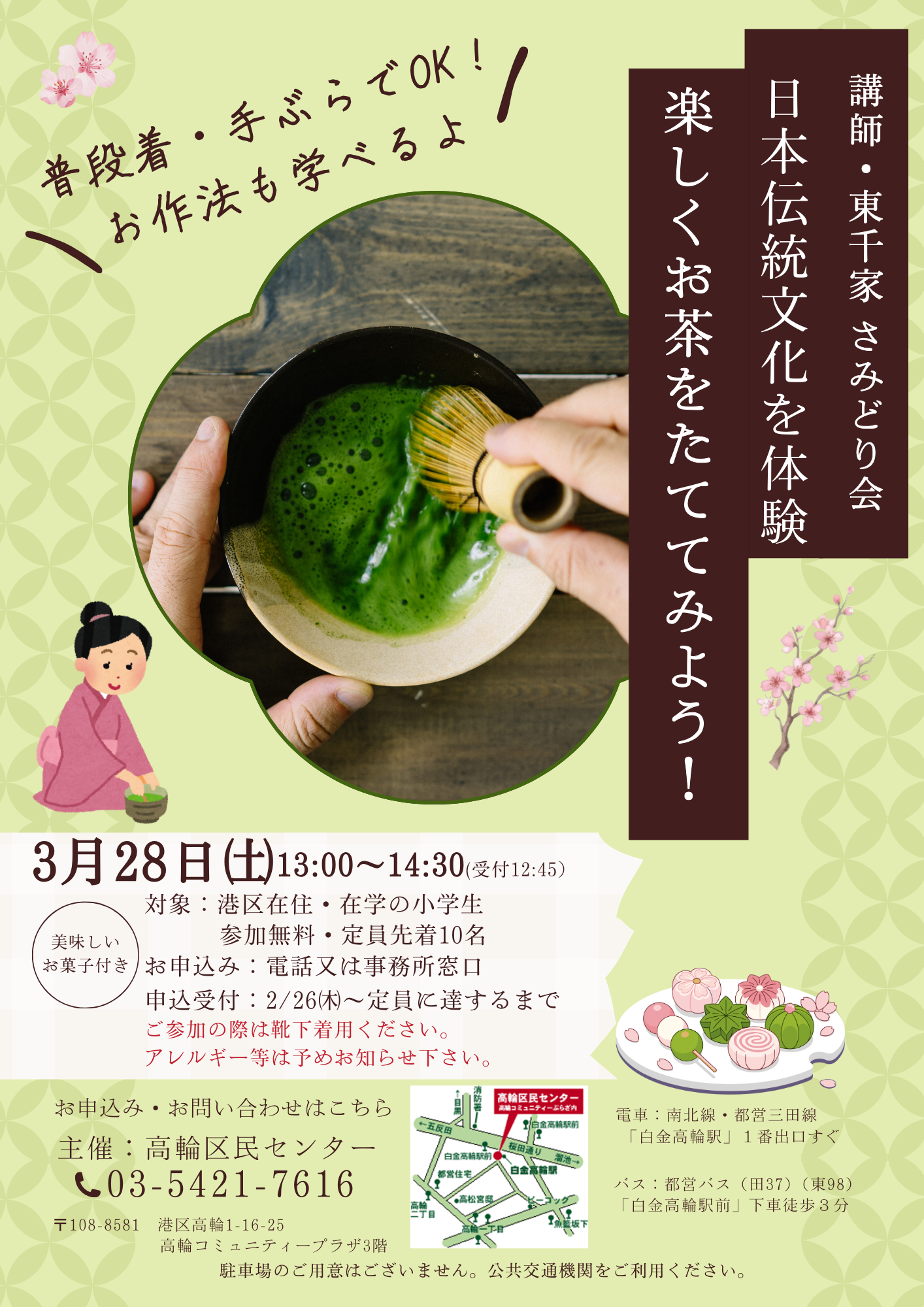 3月28日(土)13:00~14:30 日本伝統文化を体験「楽しくお茶をたててみよう!」