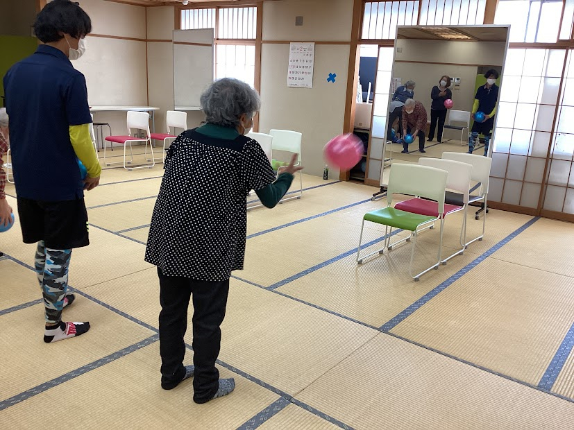 最後は、ボールを椅子の下を通す「ボーリングのような動き」と
