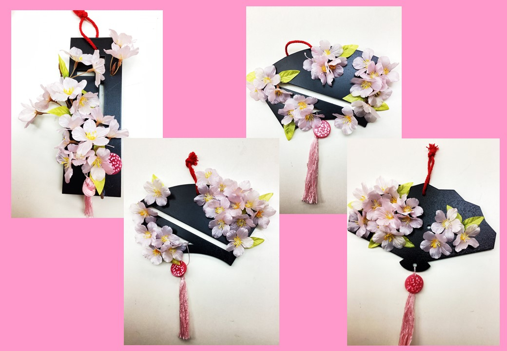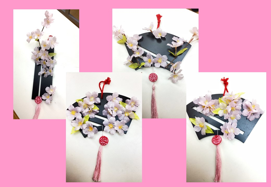 扇形などのプレートに、グルーガンで桜の花を貼りつけていきました。