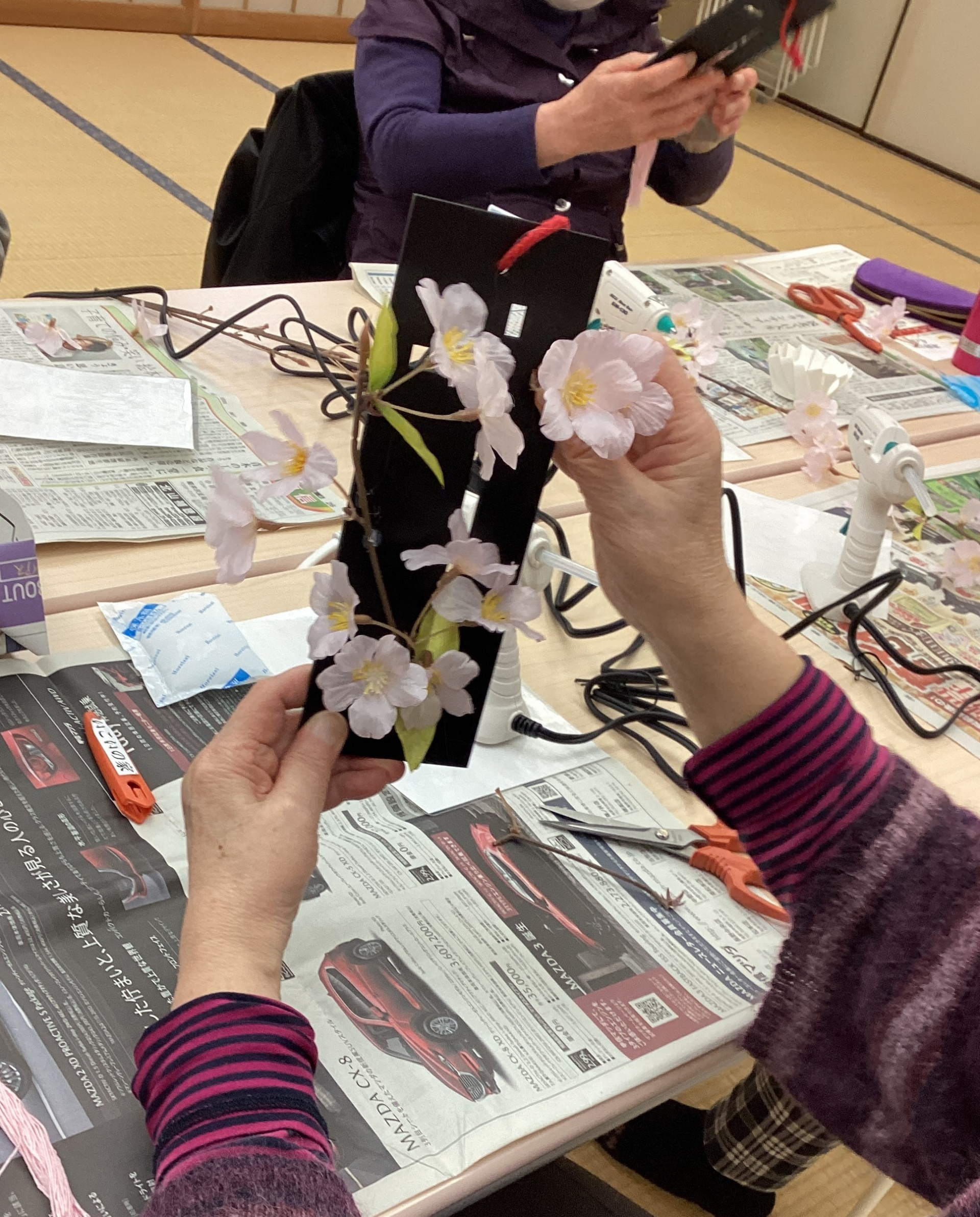 扇形などのプレートに、グルーガンで桜の花を貼りつけていきました。